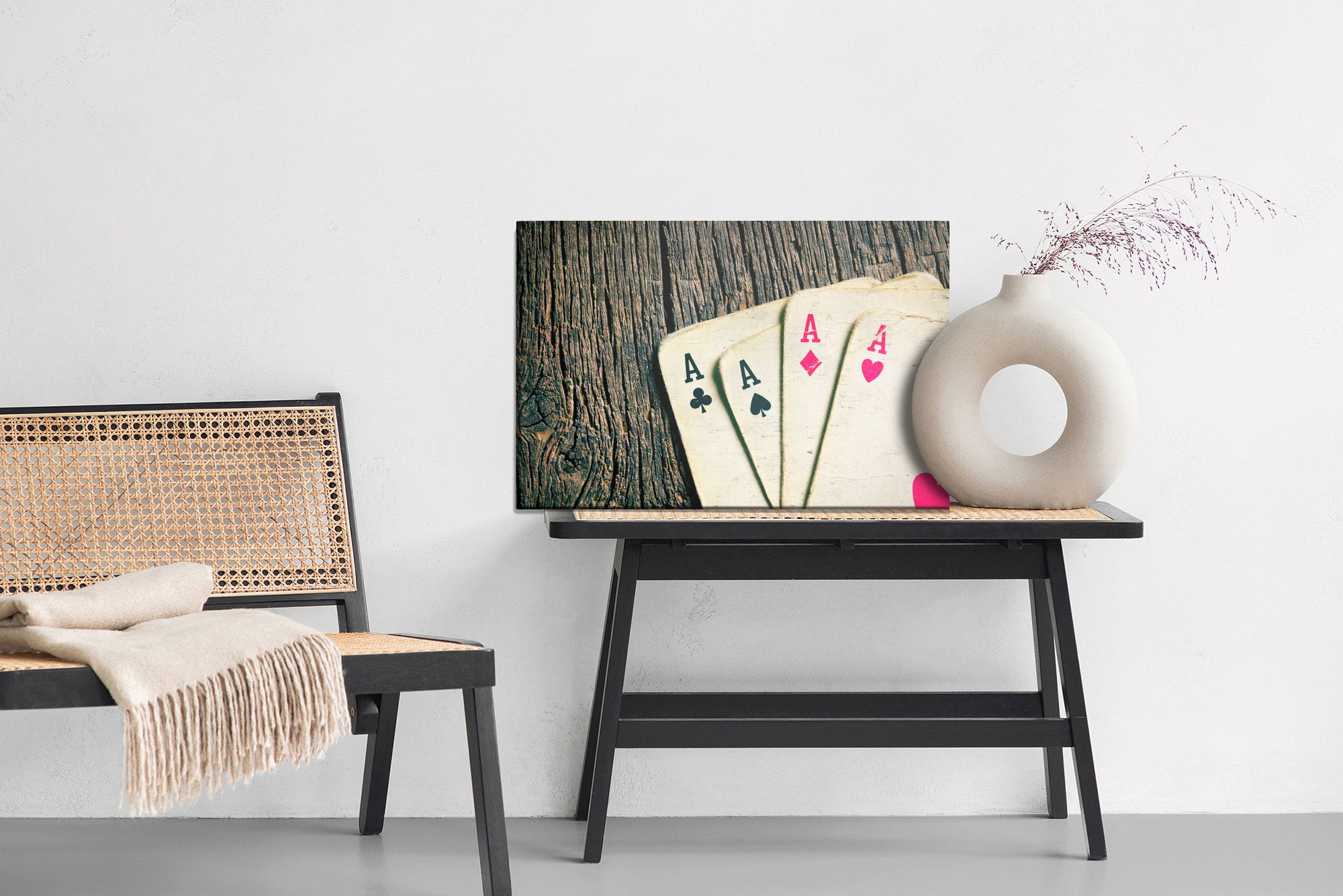 Motivet Old cards on a wooden table återges med hög färgprecision och detaljrikedom tack vare HP Latex-teknologi. Trycket sker med vattenbaserade, luktfria och GREENGUARD Gold-certifierade bläck som ger en upplösning på upp till 300 DPI. Färgerna är UV-beständiga och behåller sin styrka även i ljusa rum, vilket gör tavlan lämplig för både hem- och offentliga miljöer.
