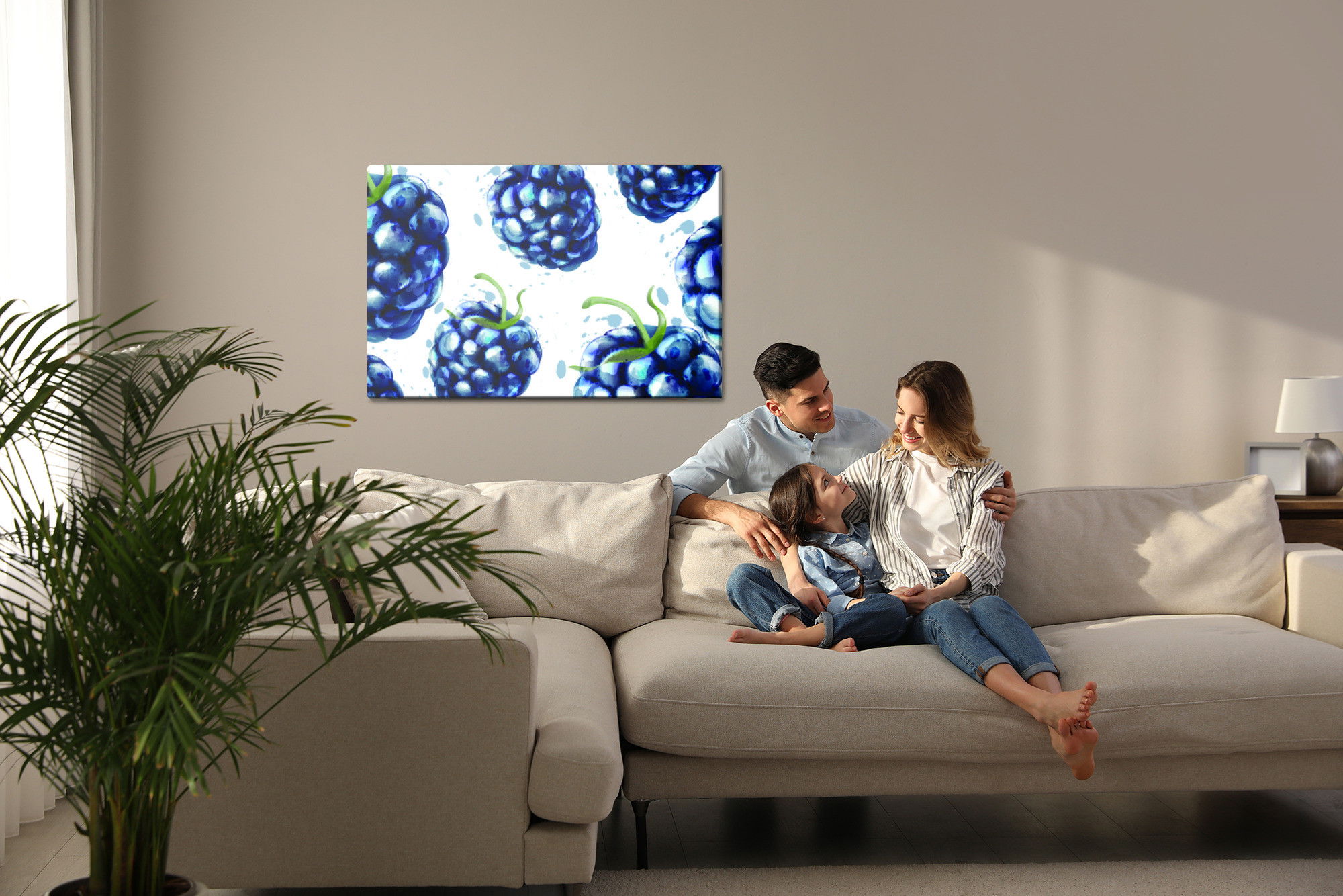 Motivet Painted blackberries återges med hög färgprecision och detaljrikedom tack vare HP Latex-teknologi. Trycket sker med vattenbaserade, luktfria och GREENGUARD Gold-certifierade bläck som ger en upplösning på upp till 300 DPI. Färgerna är UV-beständiga och behåller sin styrka även i ljusa rum, vilket gör tavlan lämplig för både hem- och offentliga miljöer.