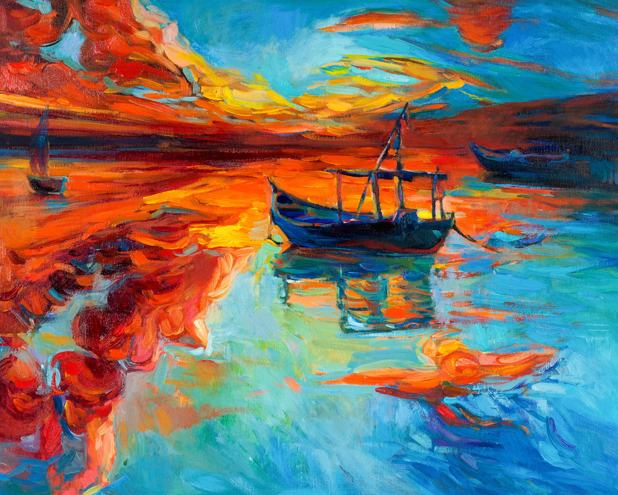 Ljuddämpande tavla – Painted boats in the sea för lugnare rum och mjukare akustik