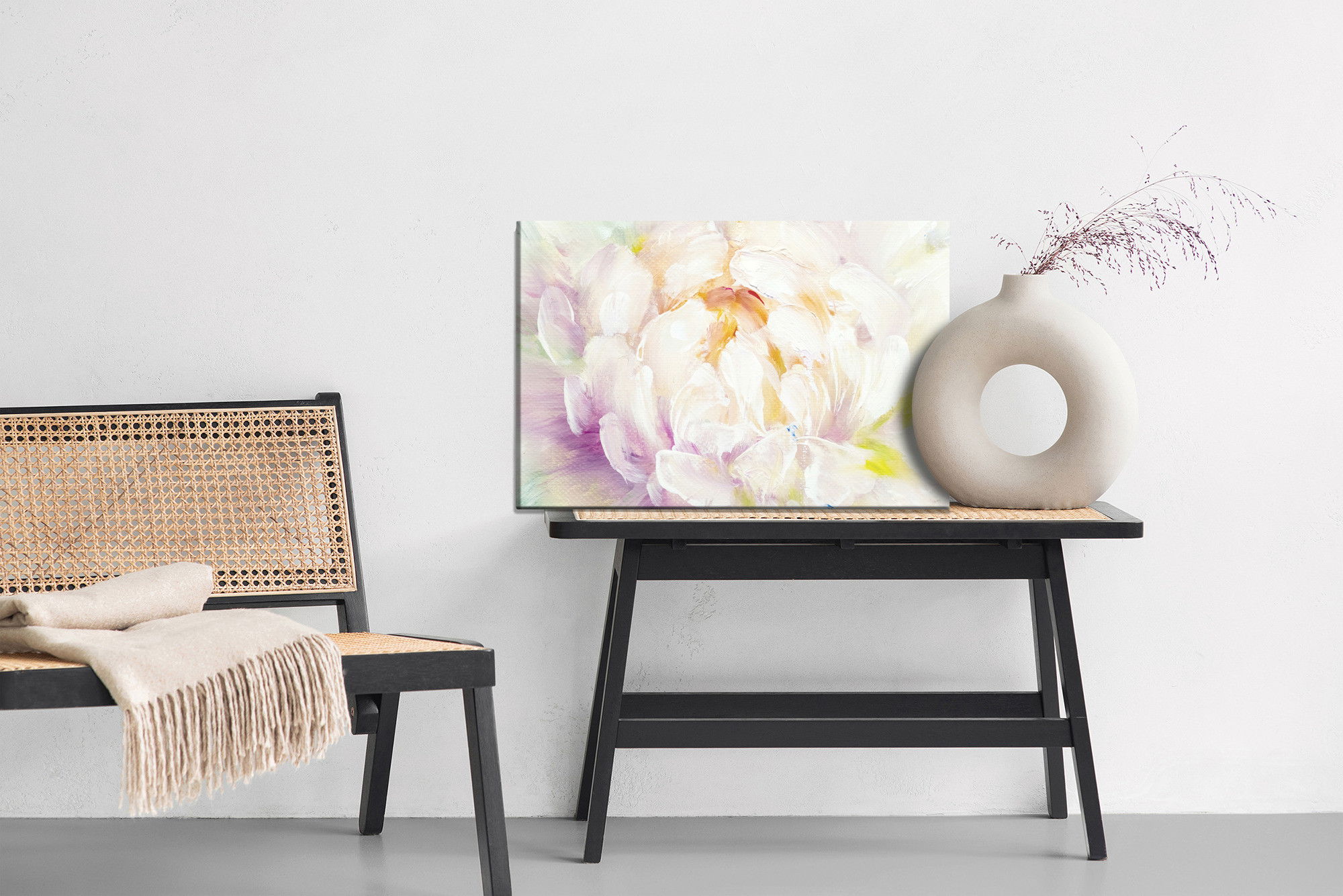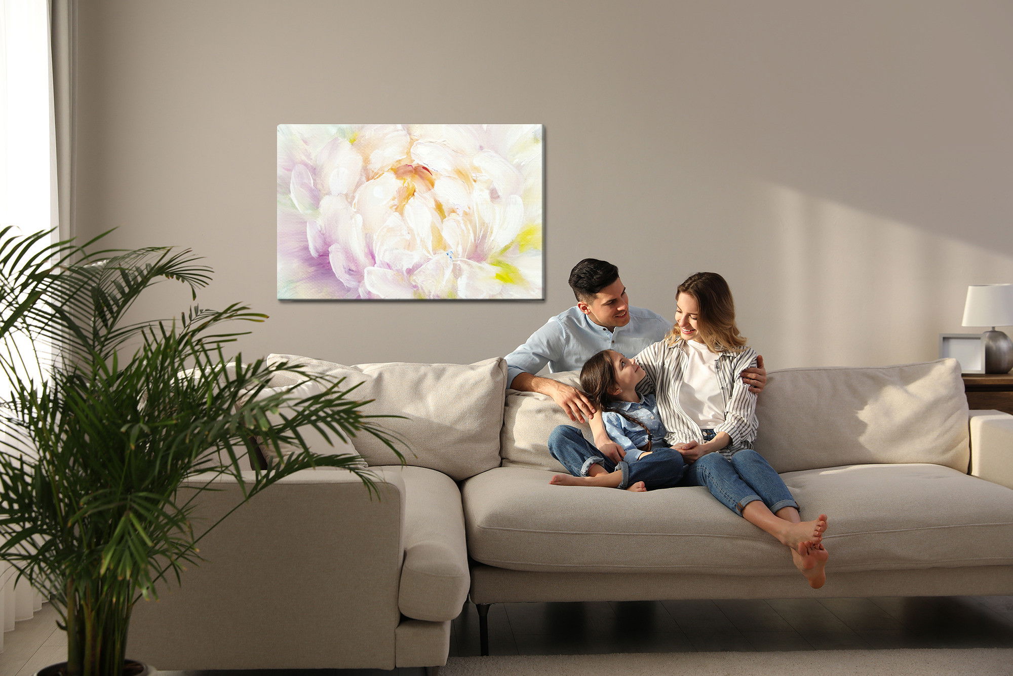 Motivet Painted peony flowers återges med hög färgprecision och detaljrikedom tack vare HP Latex-teknologi. Trycket sker med vattenbaserade, luktfria och GREENGUARD Gold-certifierade bläck som ger en upplösning på upp till 300 DPI. Färgerna är UV-beständiga och behåller sin styrka även i ljusa rum, vilket gör tavlan lämplig för både hem- och offentliga miljöer.