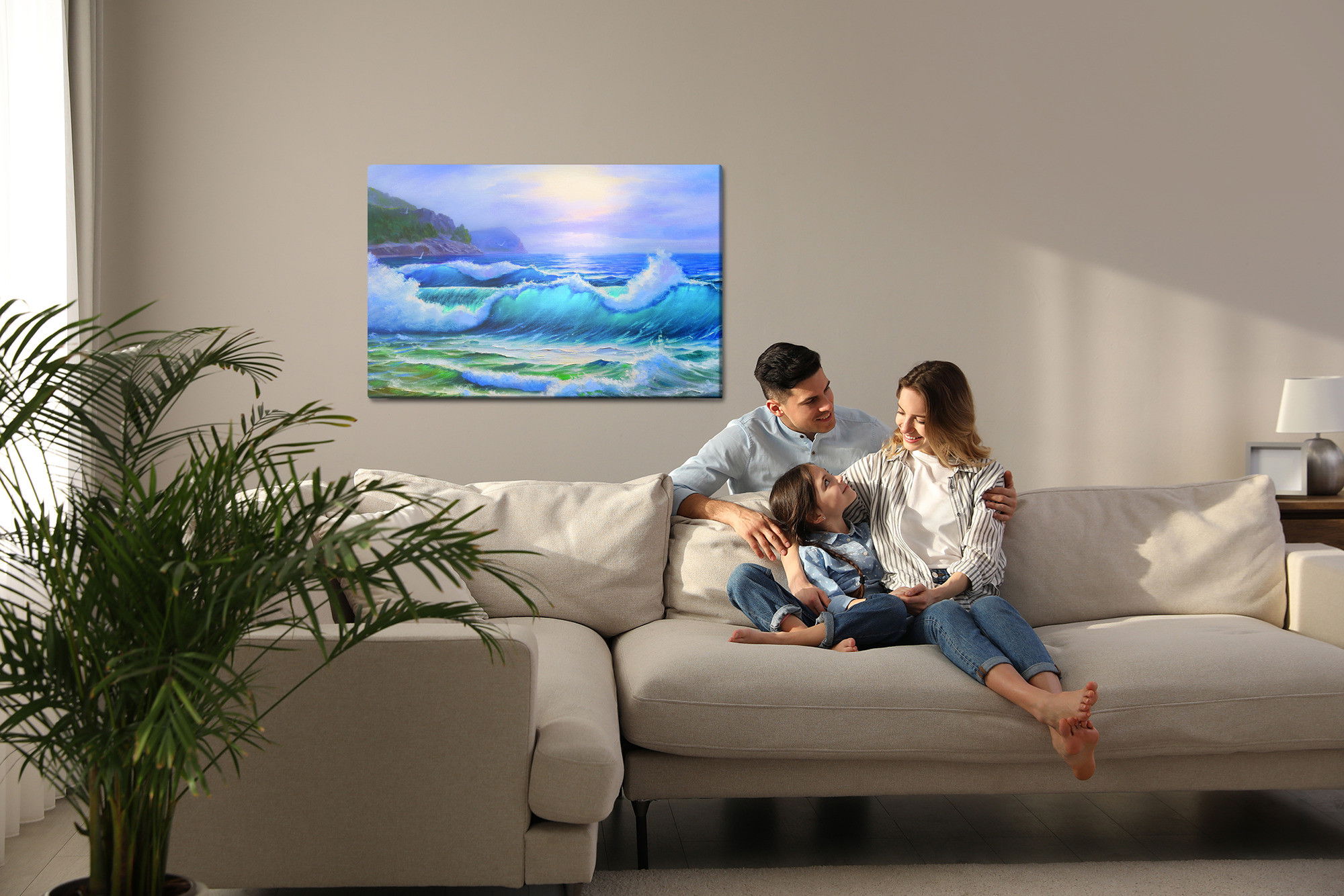 Placera tavlan där du upplever mycket eko eller hög ljudnivå, till exempel i öppna planlösningar, hemmakontor eller sociala ytor. Motiv i denna kategori gör sig särskilt bra i rum där du vill skapa en genomtänkt och sammanhängande känsla. Motiv med hav, vatten och horisonter ger rummet en lugn, djup känsla där mjuka färgskiftningar och ljusreflektioner förstärker atmosfären.