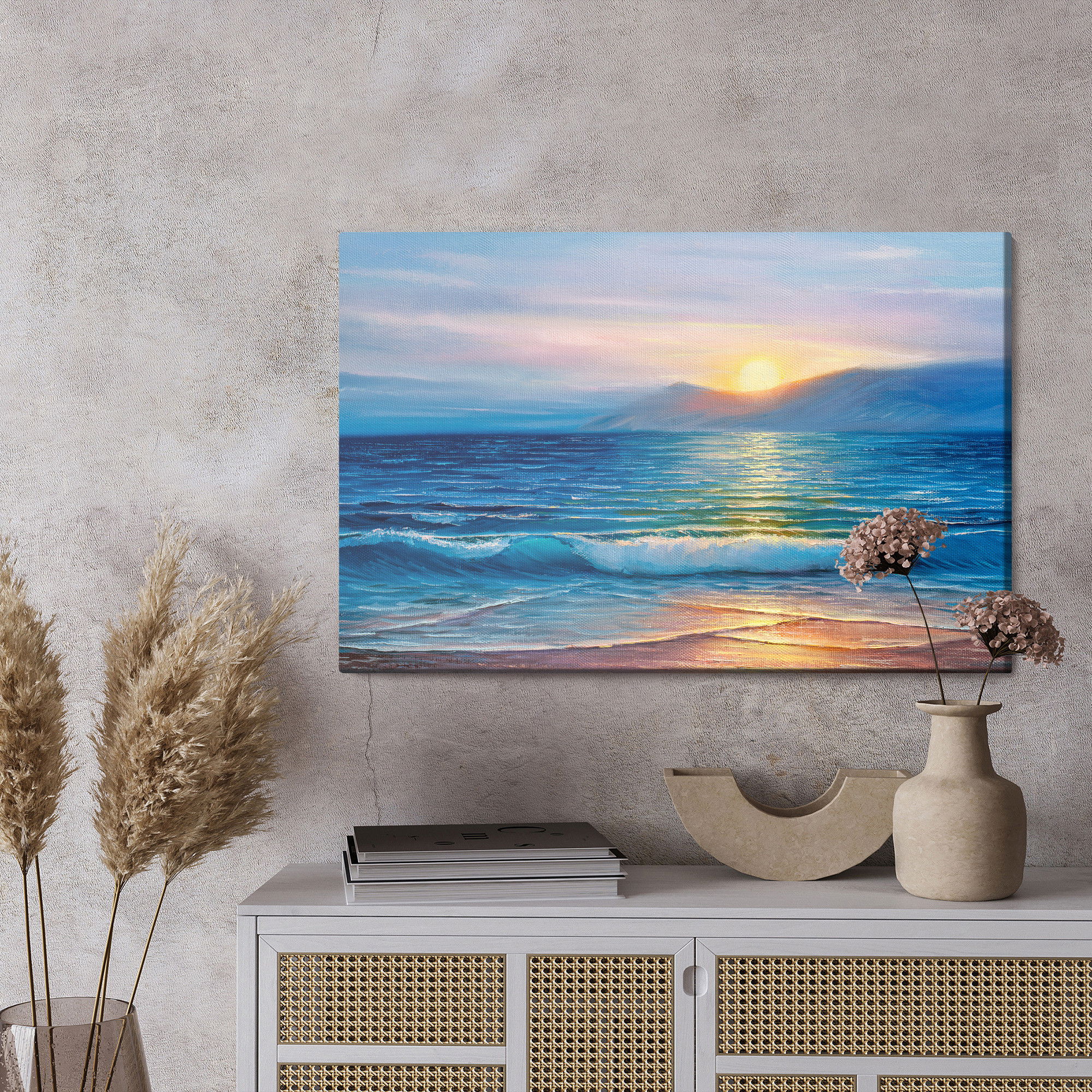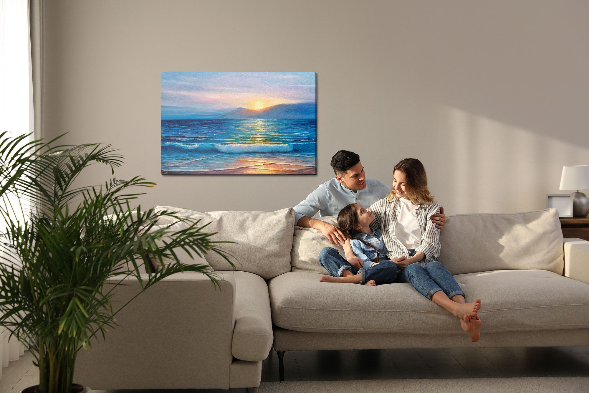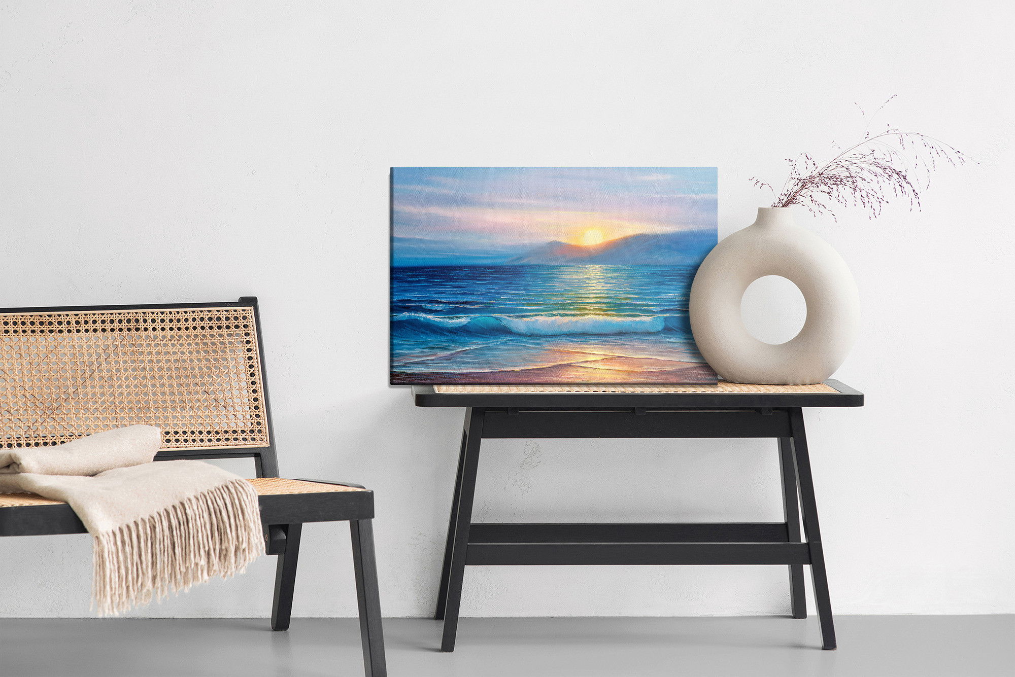 Varje tavla monteras på en massiv fururam. Format upp till 70×50 cm har en ram på 15 mm, medan format från 90×60 cm och uppåt har en ram på 20 mm. Den exakta dukspänningen gör att tavlan håller sin form över tid. Motivet Painted sunset over the sea trycks runt hela ramen vilket ger ett stilrent galleriuttryck där tavlan är lika vacker från sidan som framifrån. Kombinationen av rak dukspänning, rena linjer och korrekt tryck ger en professionell finish.