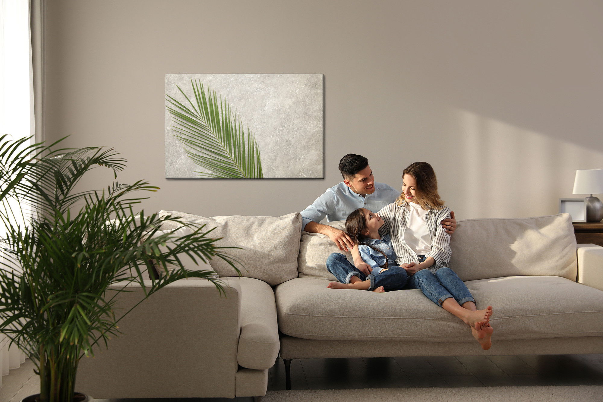 Varje tavla monteras på en massiv fururam. Format upp till 70×50 cm har en ram på 15 mm, medan format från 90×60 cm och uppåt har en ram på 20 mm. Den exakta dukspänningen gör att tavlan håller sin form över tid. Motivet Palm leaf on a concrete trycks runt hela ramen vilket ger ett stilrent galleriuttryck där tavlan är lika vacker från sidan som framifrån. Kombinationen av rak dukspänning, rena linjer och korrekt tryck ger en professionell finish.