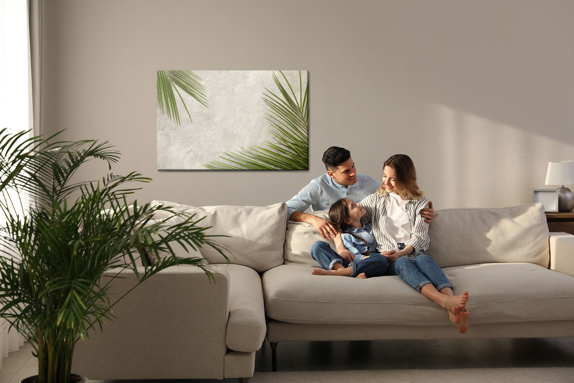 Motivet Palm leaves on a concrete återges med hög färgprecision och detaljrikedom tack vare HP Latex-teknologi. Trycket sker med vattenbaserade, luktfria och GREENGUARD Gold-certifierade bläck som ger en upplösning på upp till 300 DPI. Färgerna är UV-beständiga och behåller sin styrka även i ljusa rum, vilket gör tavlan lämplig för både hem- och offentliga miljöer.