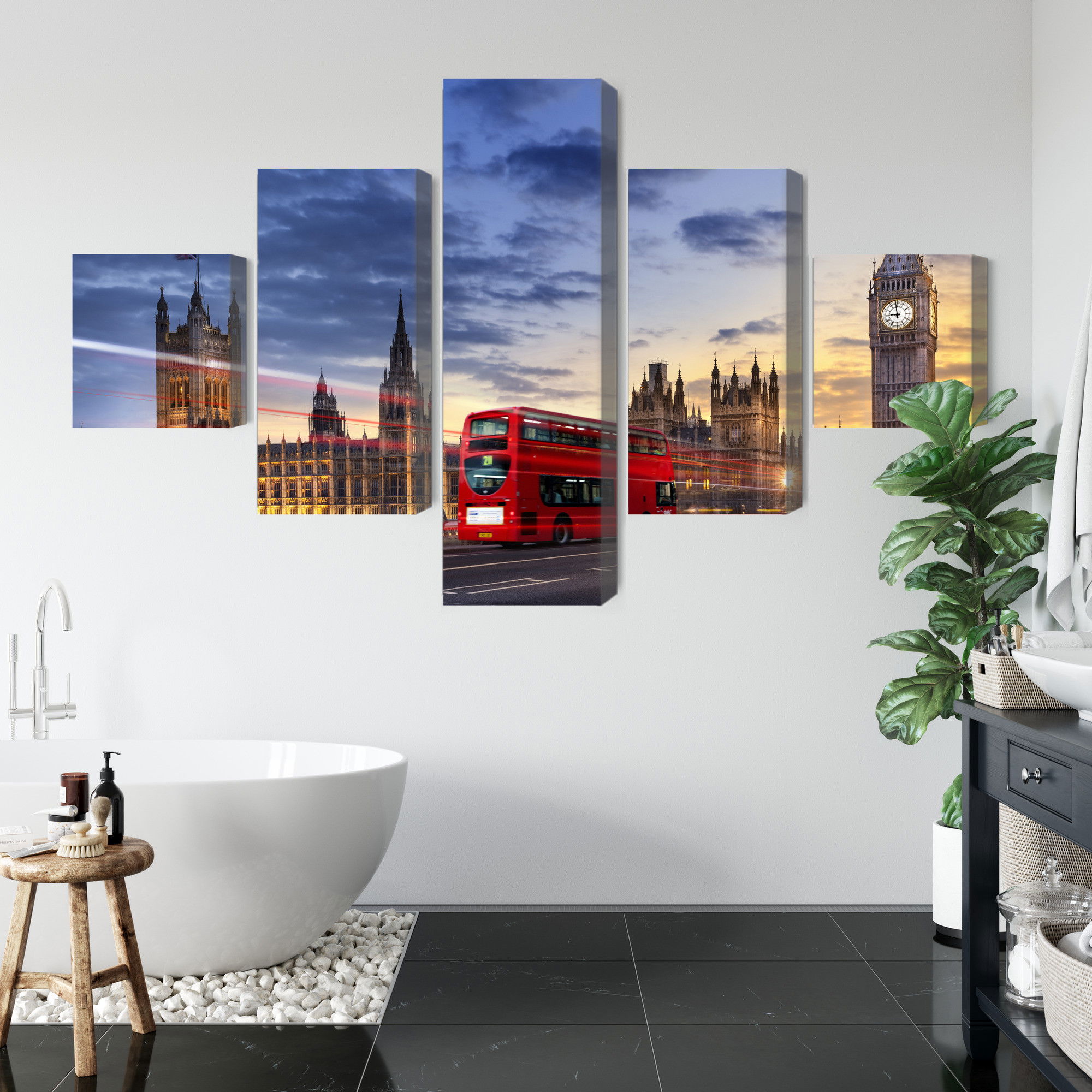 Varje tavla monteras på en massiv fururam. Format upp till 70×50 cm har en ram på 15 mm, medan format från 90×60 cm och uppåt har en ram på 20 mm. Den exakta dukspänningen gör att tavlan håller sin form över tid. Motivet Panorama of westminster trycks runt hela ramen vilket ger ett stilrent galleriuttryck där tavlan är lika vacker från sidan som framifrån. Kombinationen av rak dukspänning, rena linjer och korrekt tryck ger en professionell finish.