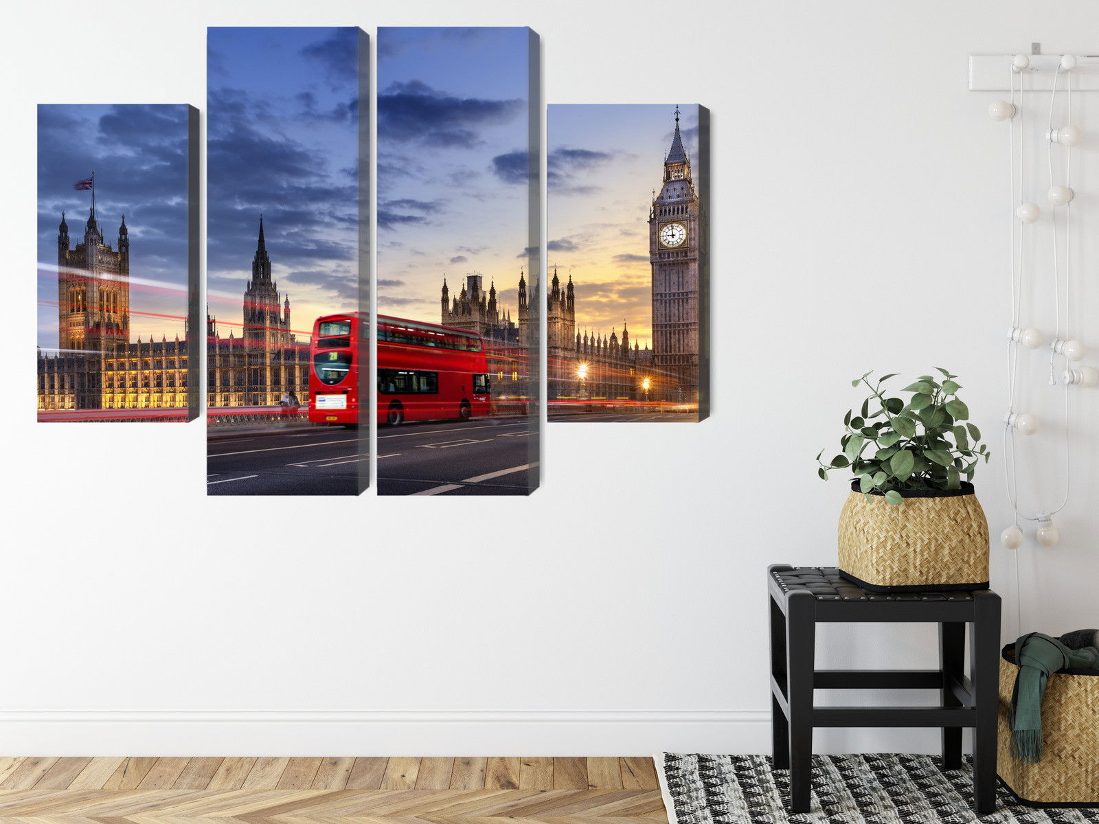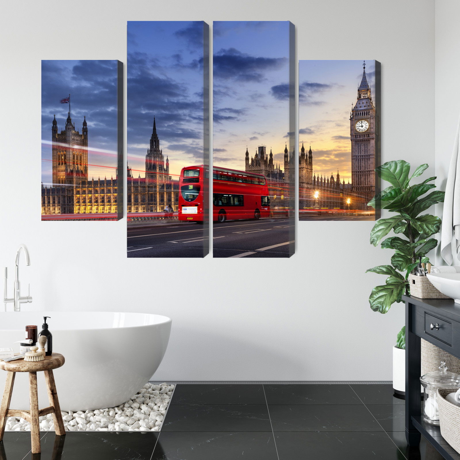 Varje tavla monteras på en massiv fururam. Format upp till 70×50 cm har en ram på 15 mm, medan format från 90×60 cm och uppåt har en ram på 20 mm. Den exakta dukspänningen gör att tavlan håller sin form över tid. Motivet Panorama of westminster trycks runt hela ramen vilket ger ett stilrent galleriuttryck där tavlan är lika vacker från sidan som framifrån. Kombinationen av rak dukspänning, rena linjer och korrekt tryck ger en professionell finish.