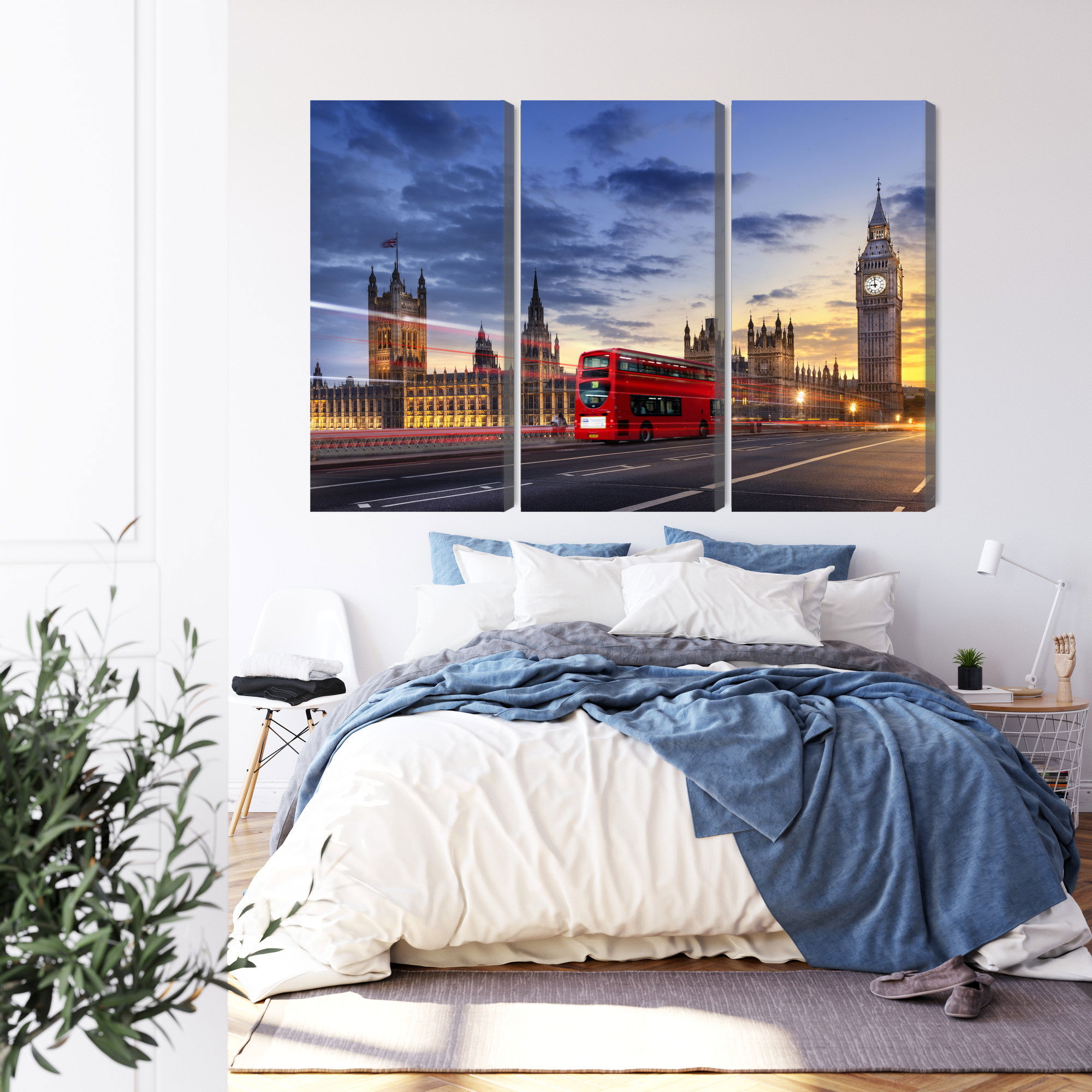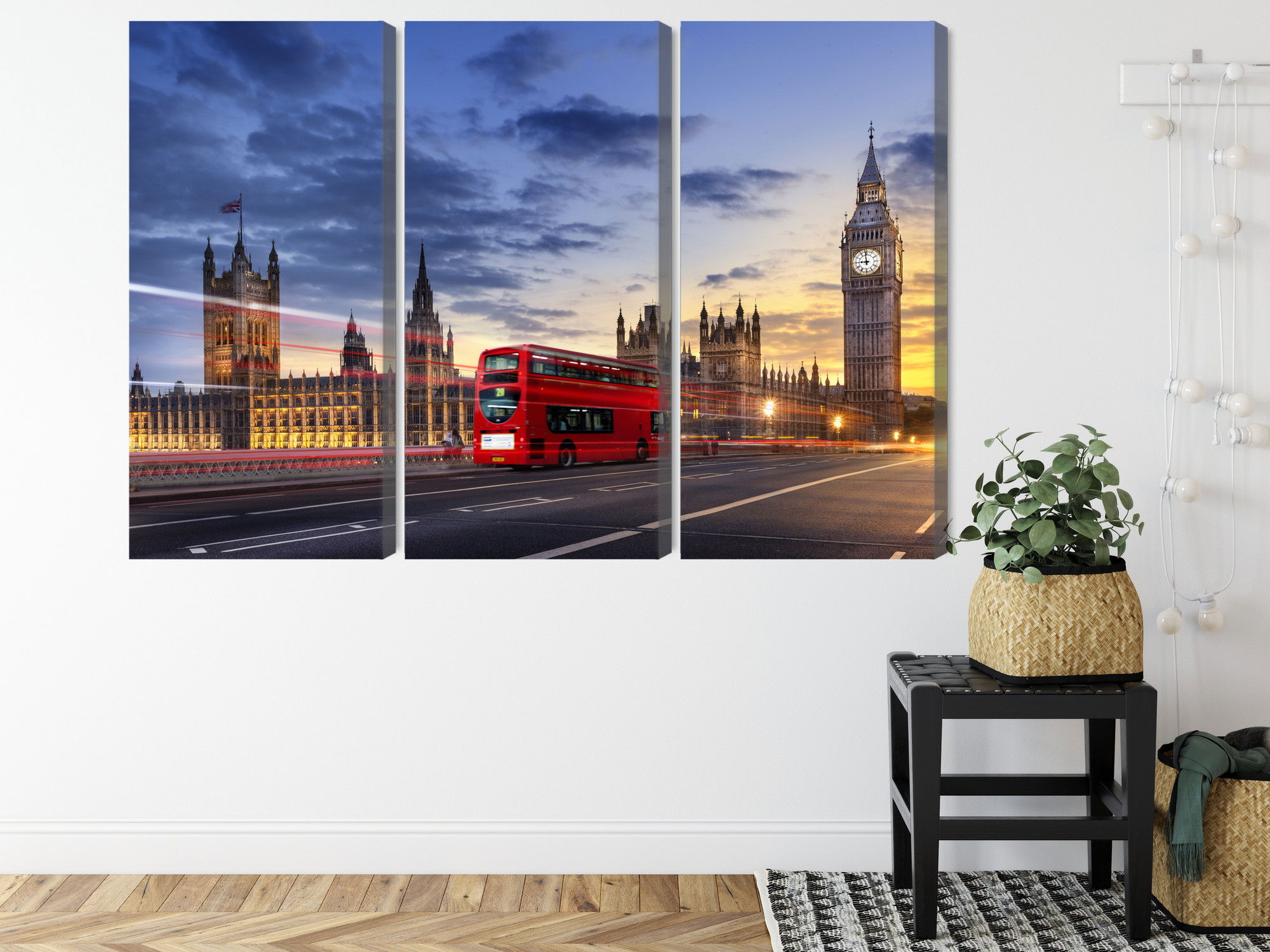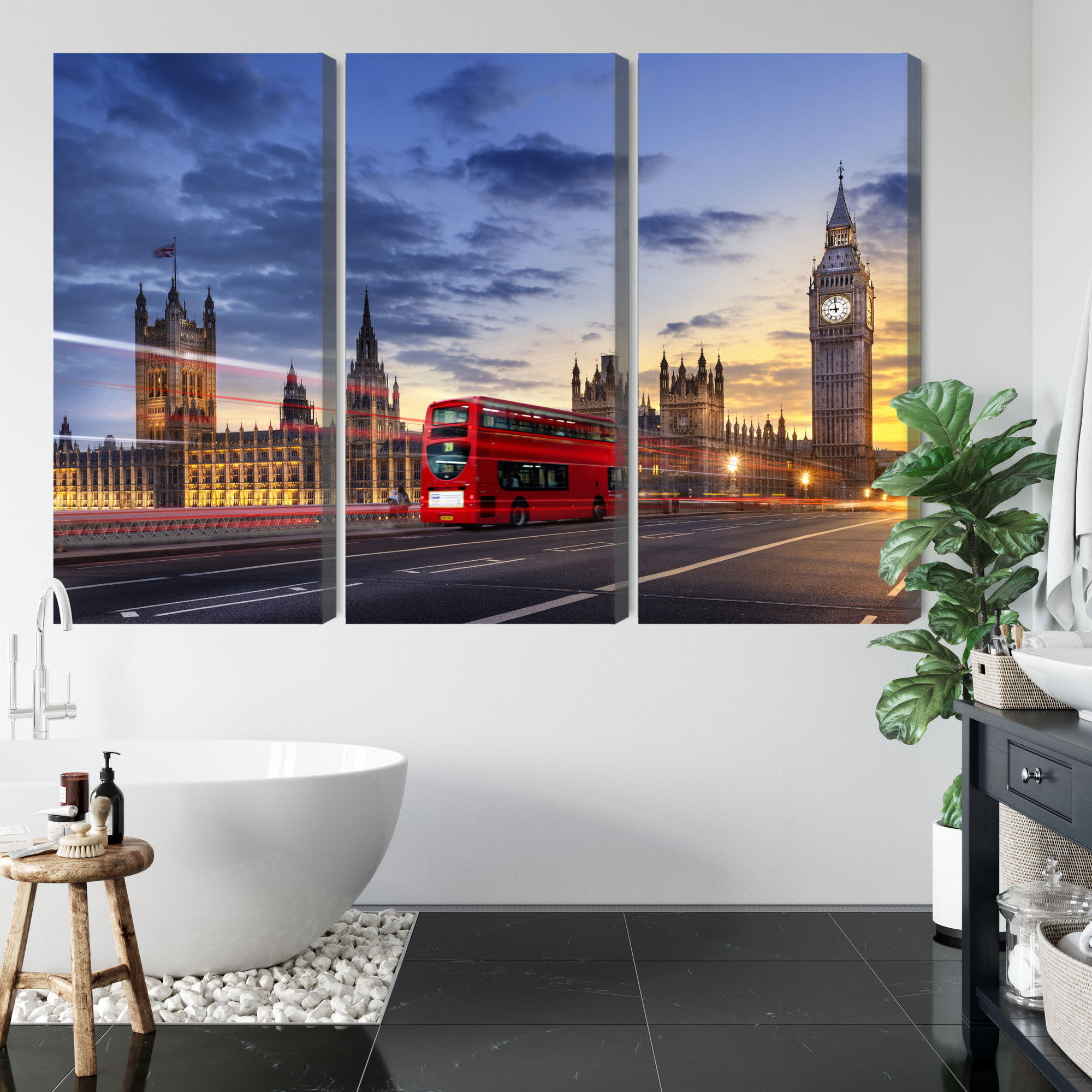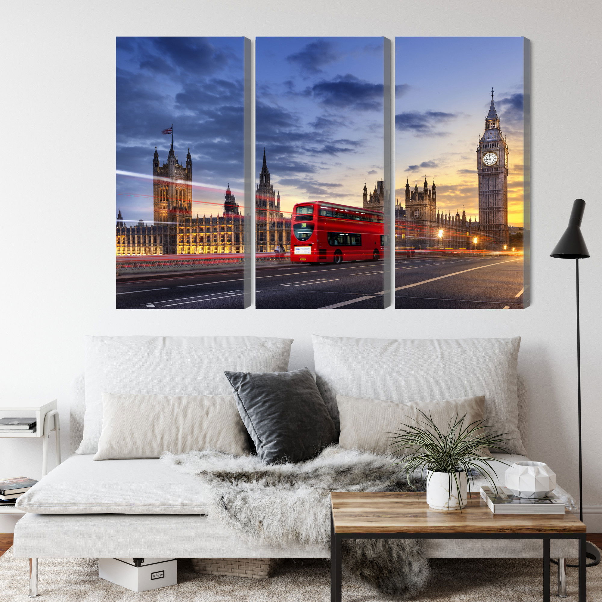 Varje tavla monteras på en massiv fururam. Format upp till 70×50 cm har en ram på 15 mm, medan format från 90×60 cm och uppåt har en ram på 20 mm. Den exakta dukspänningen gör att tavlan håller sin form över tid. Motivet Panorama of westminster trycks runt hela ramen vilket ger ett stilrent galleriuttryck där tavlan är lika vacker från sidan som framifrån. Kombinationen av rak dukspänning, rena linjer och korrekt tryck ger en professionell finish.
