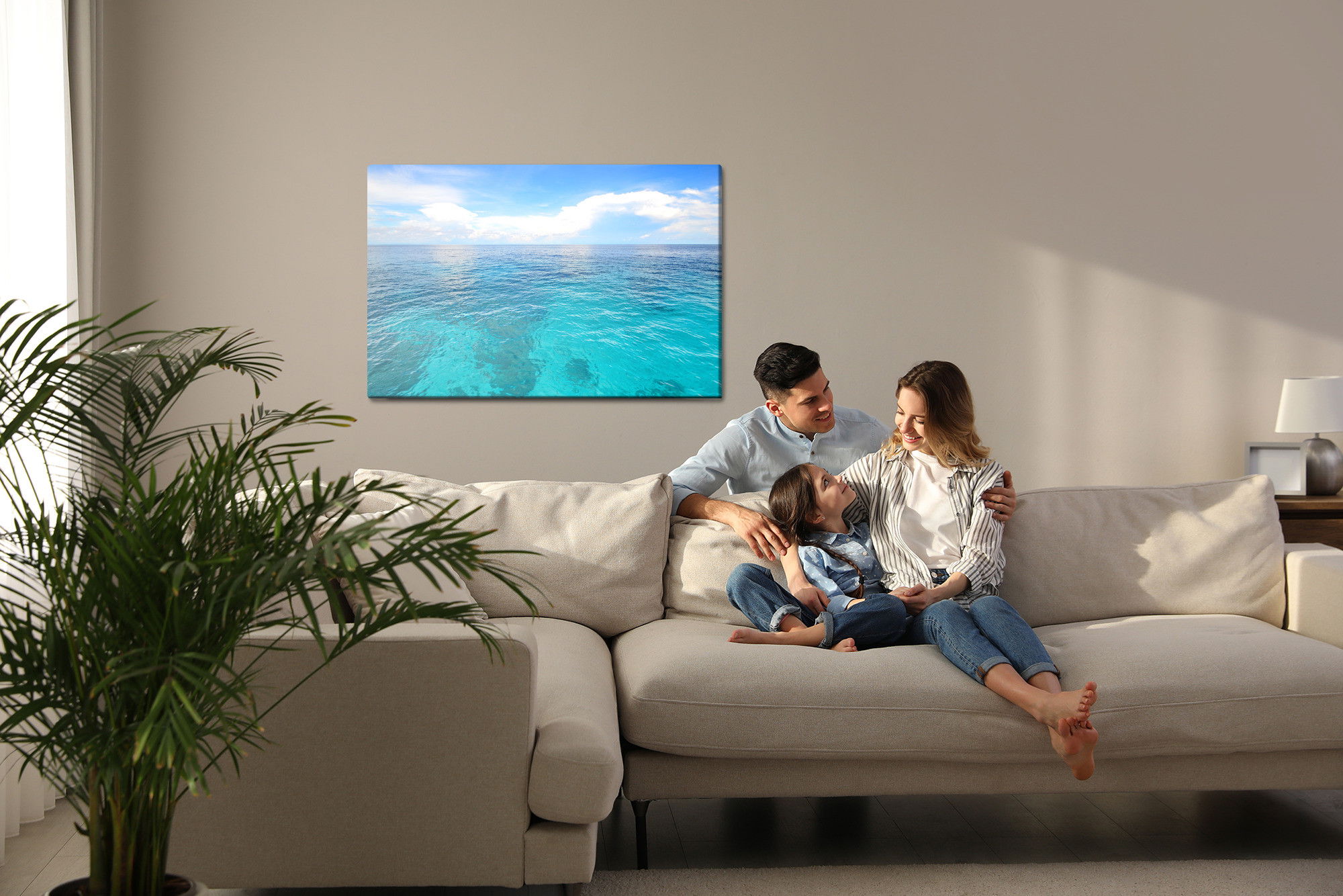 Varje tavla monteras på en massiv fururam. Format upp till 70×50 cm har en ram på 15 mm, medan format från 90×60 cm och uppåt har en ram på 20 mm. Den exakta dukspänningen gör att tavlan håller sin form över tid. Motivet Paradise sea and sky trycks runt hela ramen vilket ger ett stilrent galleriuttryck där tavlan är lika vacker från sidan som framifrån. Kombinationen av rak dukspänning, rena linjer och korrekt tryck ger en professionell finish.