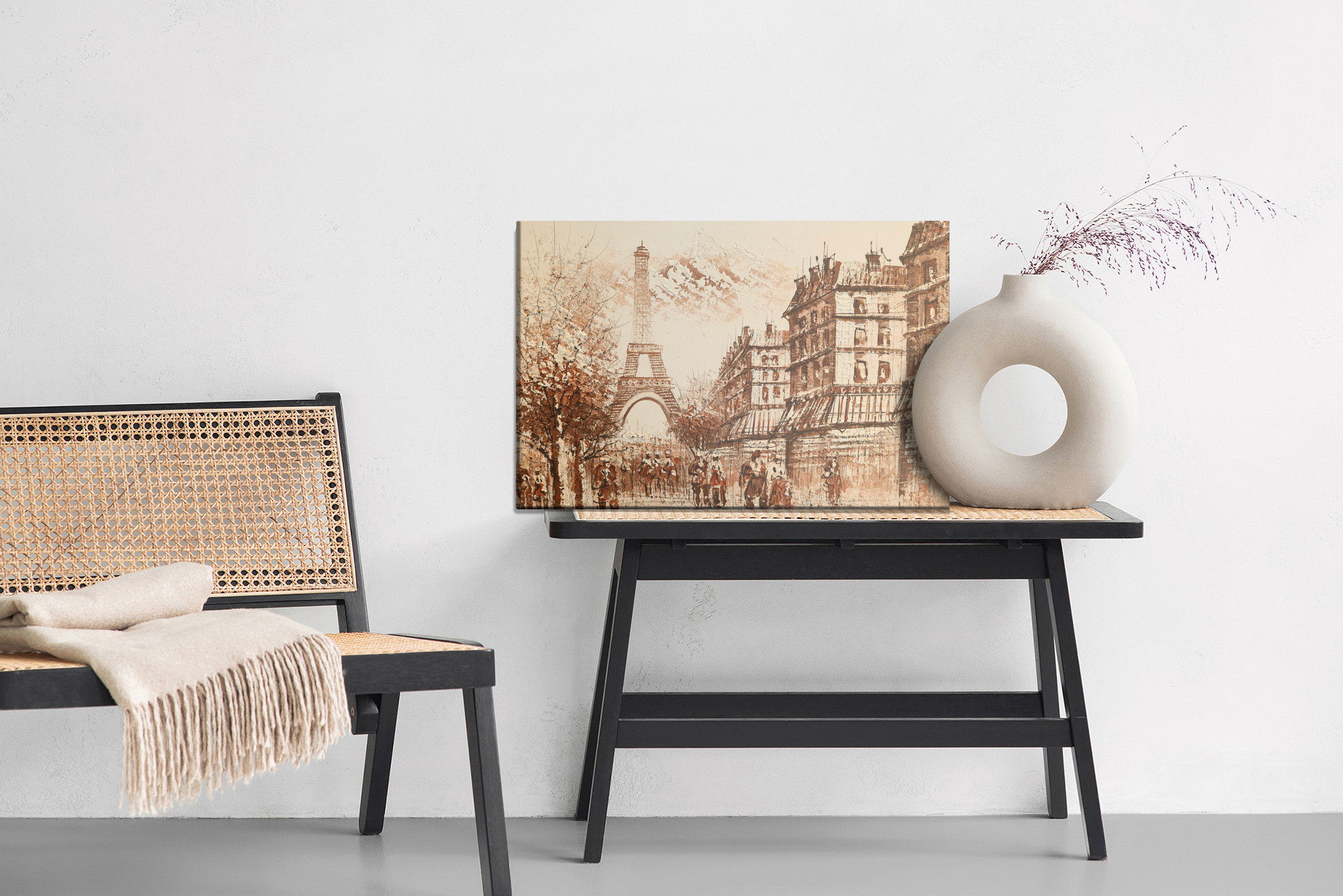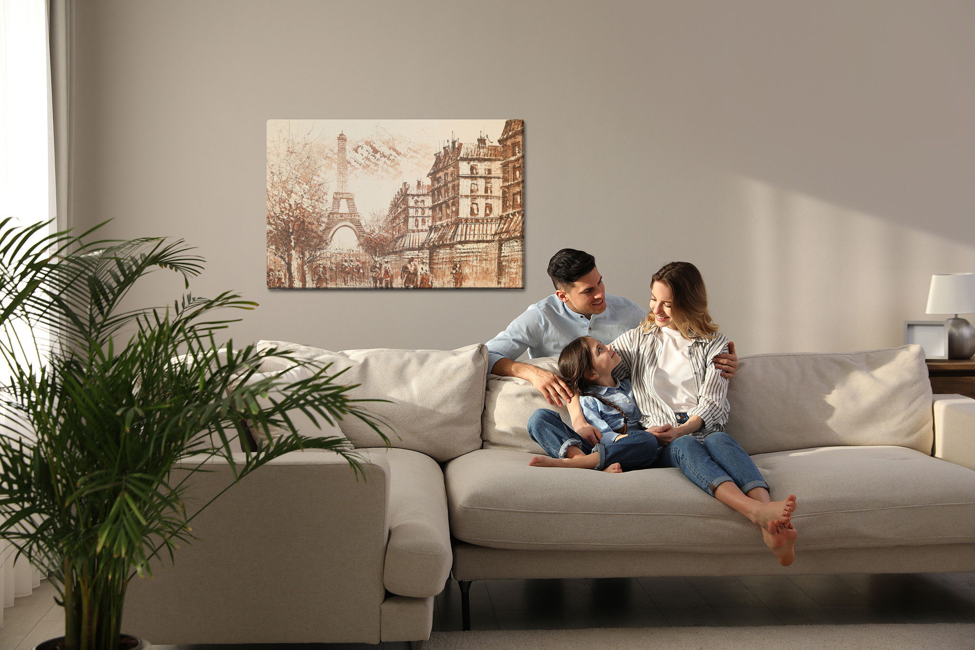 Varje tavla monteras på en massiv fururam. Format upp till 70×50 cm har en ram på 15 mm, medan format från 90×60 cm och uppåt har en ram på 20 mm. Den exakta dukspänningen gör att tavlan håller sin form över tid. Motivet Paris panorama in shades trycks runt hela ramen vilket ger ett stilrent galleriuttryck där tavlan är lika vacker från sidan som framifrån. Kombinationen av rak dukspänning, rena linjer och korrekt tryck ger en professionell finish.
