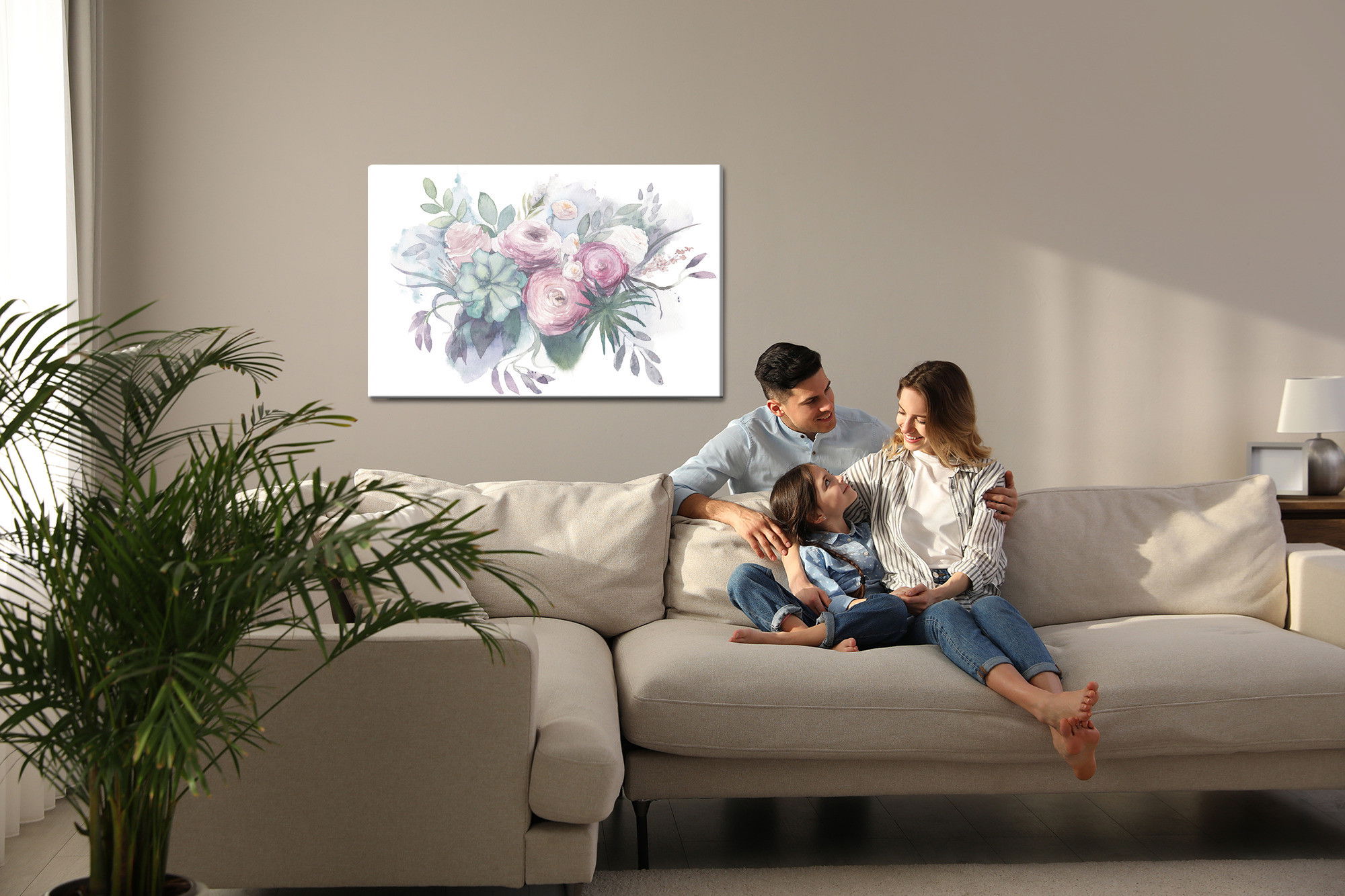 Varje tavla monteras på en massiv fururam. Format upp till 70×50 cm har en ram på 15 mm, medan format från 90×60 cm och uppåt har en ram på 20 mm. Den exakta dukspänningen gör att tavlan håller sin form över tid. Motivet Pastel flowers painted trycks runt hela ramen vilket ger ett stilrent galleriuttryck där tavlan är lika vacker från sidan som framifrån. Kombinationen av rak dukspänning, rena linjer och korrekt tryck ger en professionell finish.