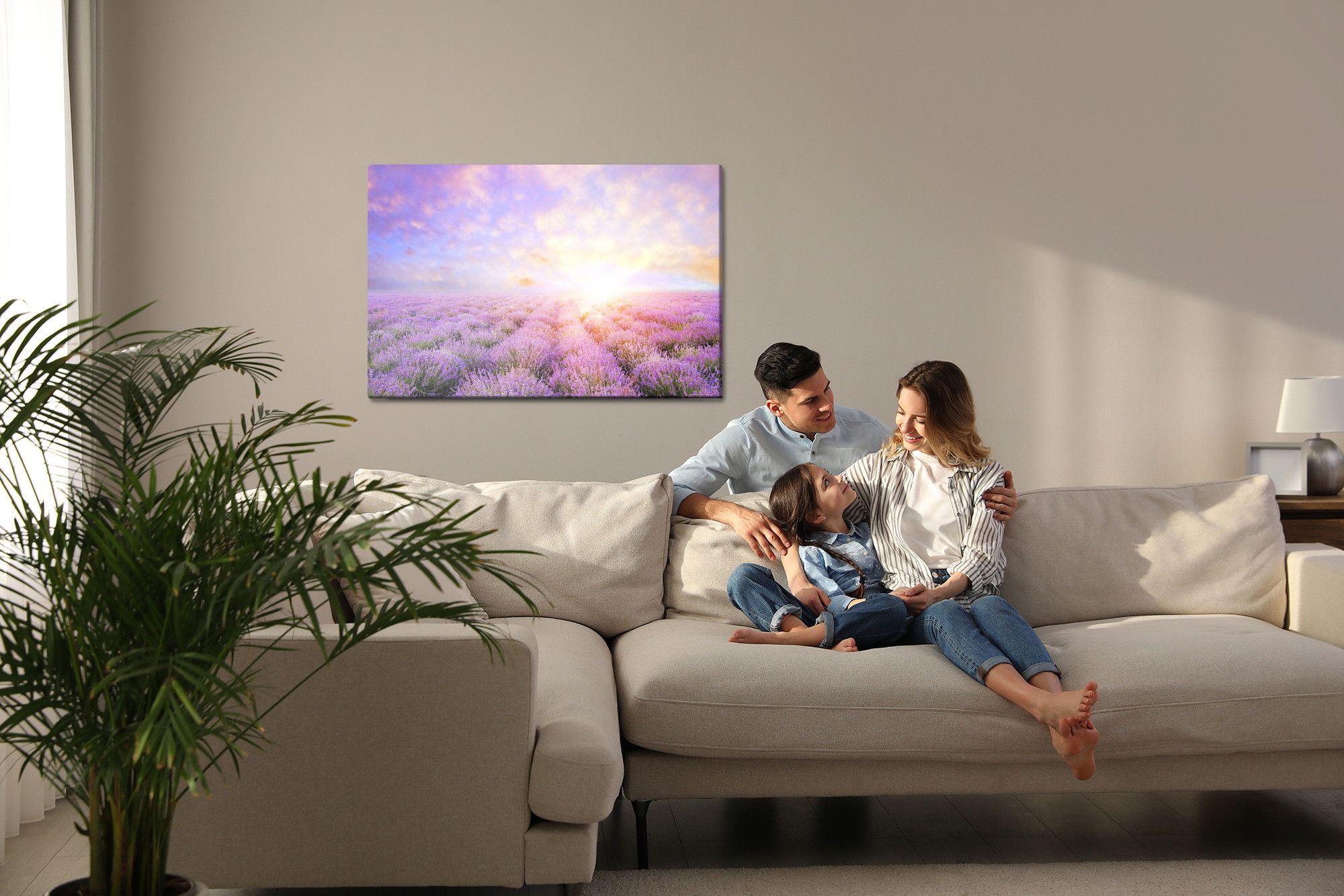 Motivet Pastel lavender field återges med hög färgprecision och detaljrikedom tack vare HP Latex-teknologi. Trycket sker med vattenbaserade, luktfria och GREENGUARD Gold-certifierade bläck som ger en upplösning på upp till 300 DPI. Färgerna är UV-beständiga och behåller sin styrka även i ljusa rum, vilket gör tavlan lämplig för både hem- och offentliga miljöer.