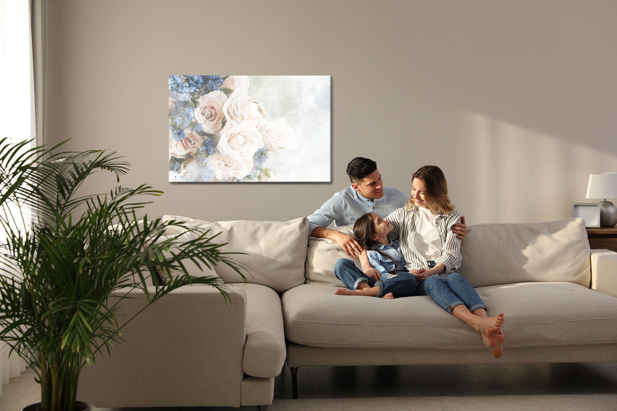Varje tavla monteras på en massiv fururam. Format upp till 70×50 cm har en ram på 15 mm, medan format från 90×60 cm och uppåt har en ram på 20 mm. Den exakta dukspänningen gör att tavlan håller sin form över tid. Motivet Pastel roses painted trycks runt hela ramen vilket ger ett stilrent galleriuttryck där tavlan är lika vacker från sidan som framifrån. Kombinationen av rak dukspänning, rena linjer och korrekt tryck ger en professionell finish.