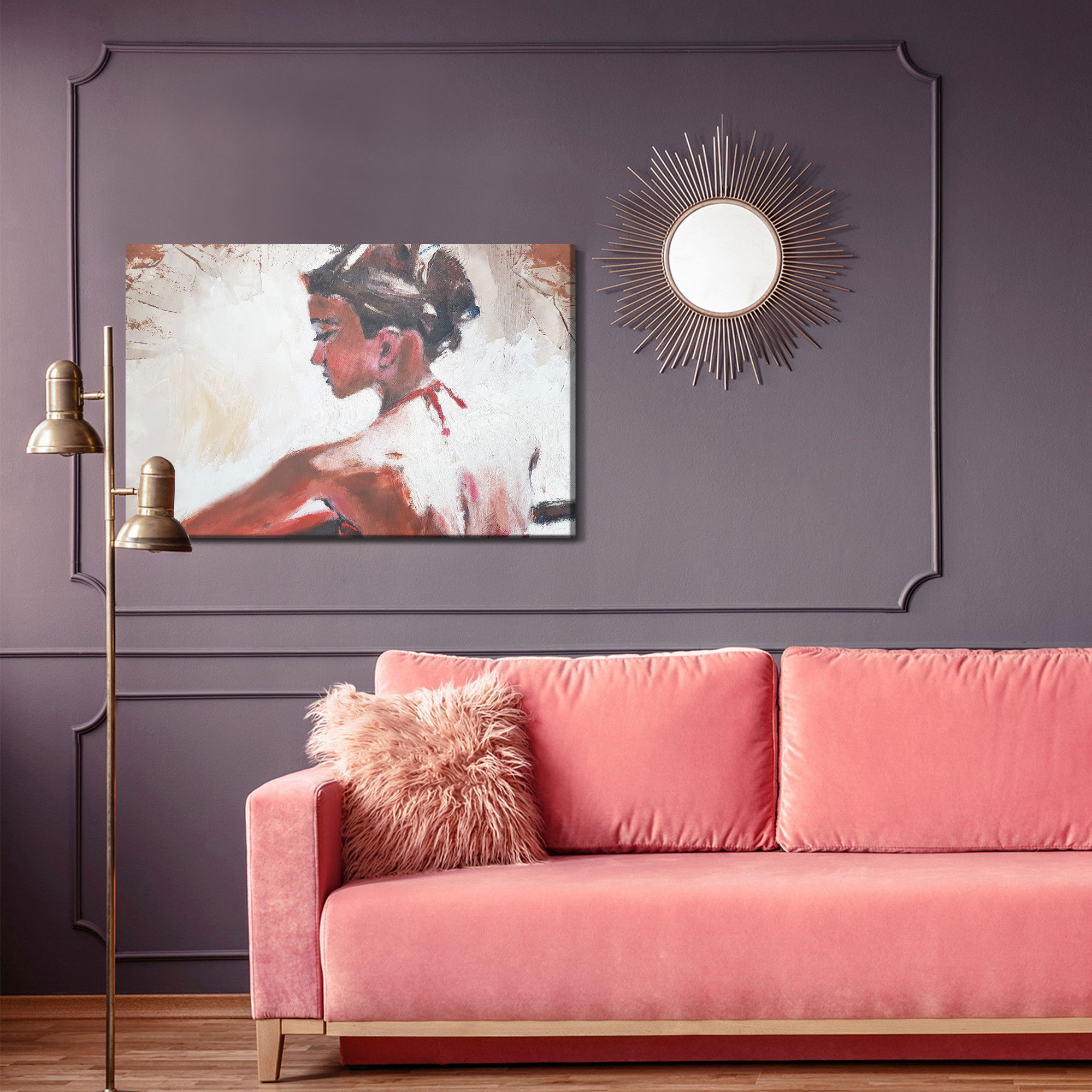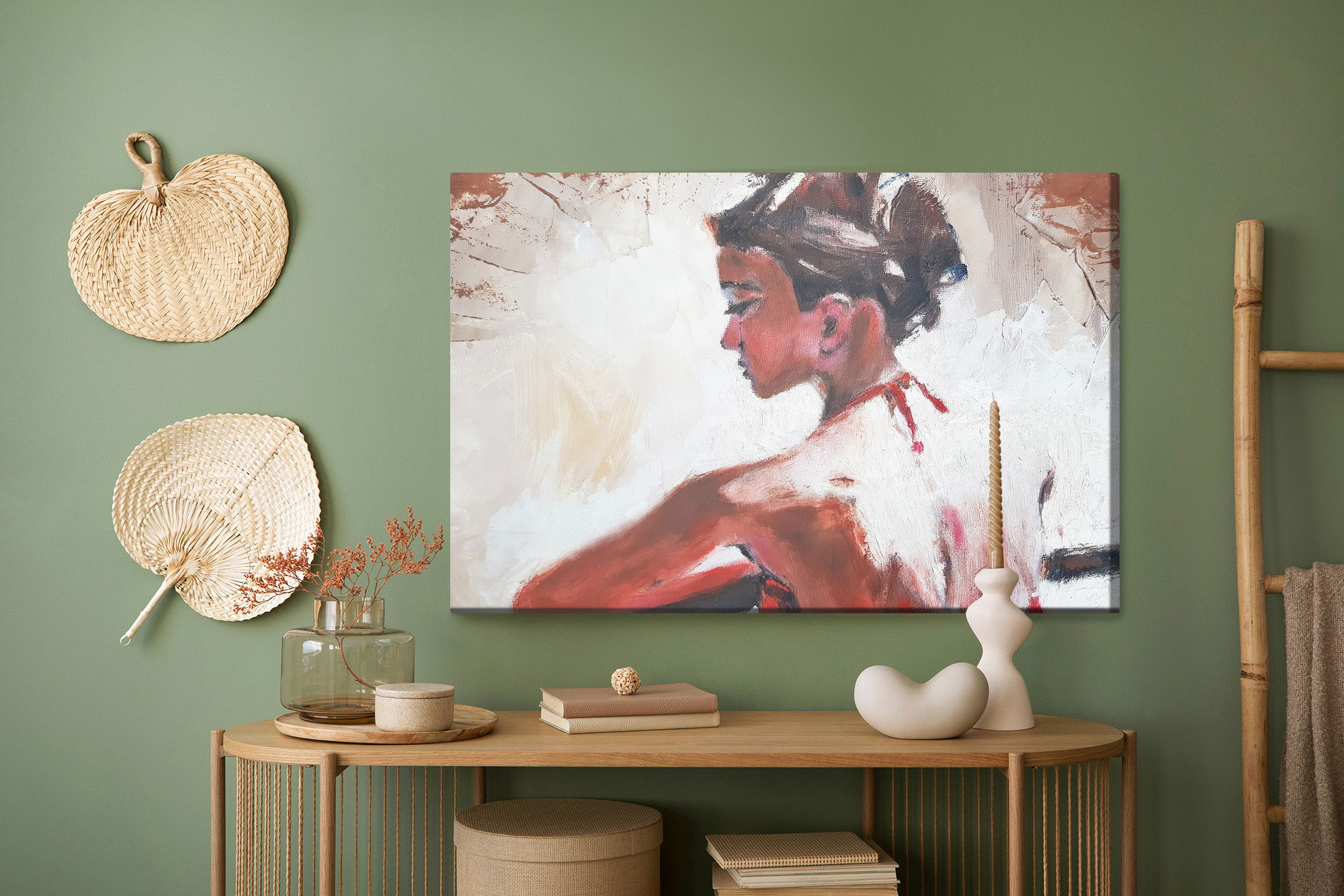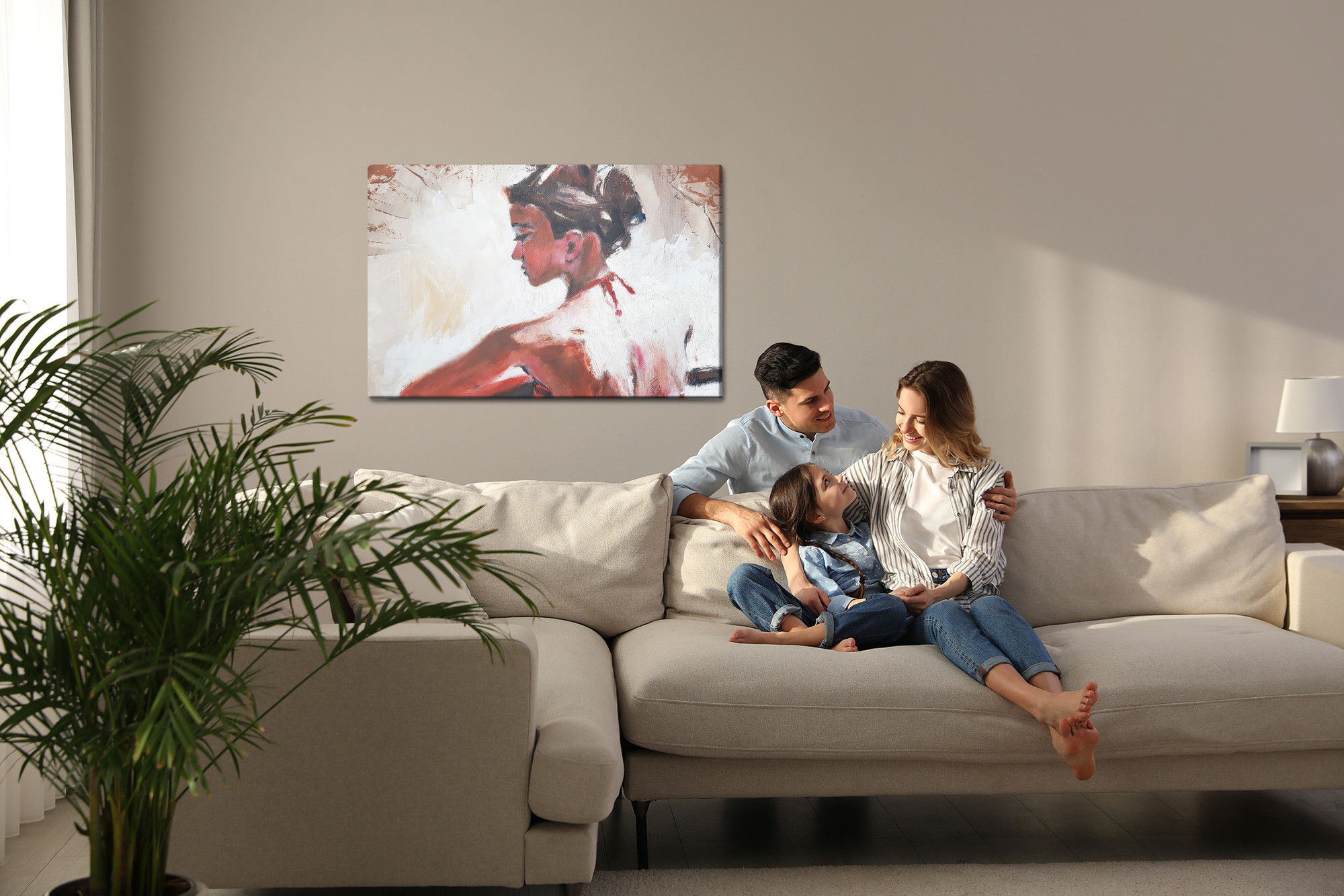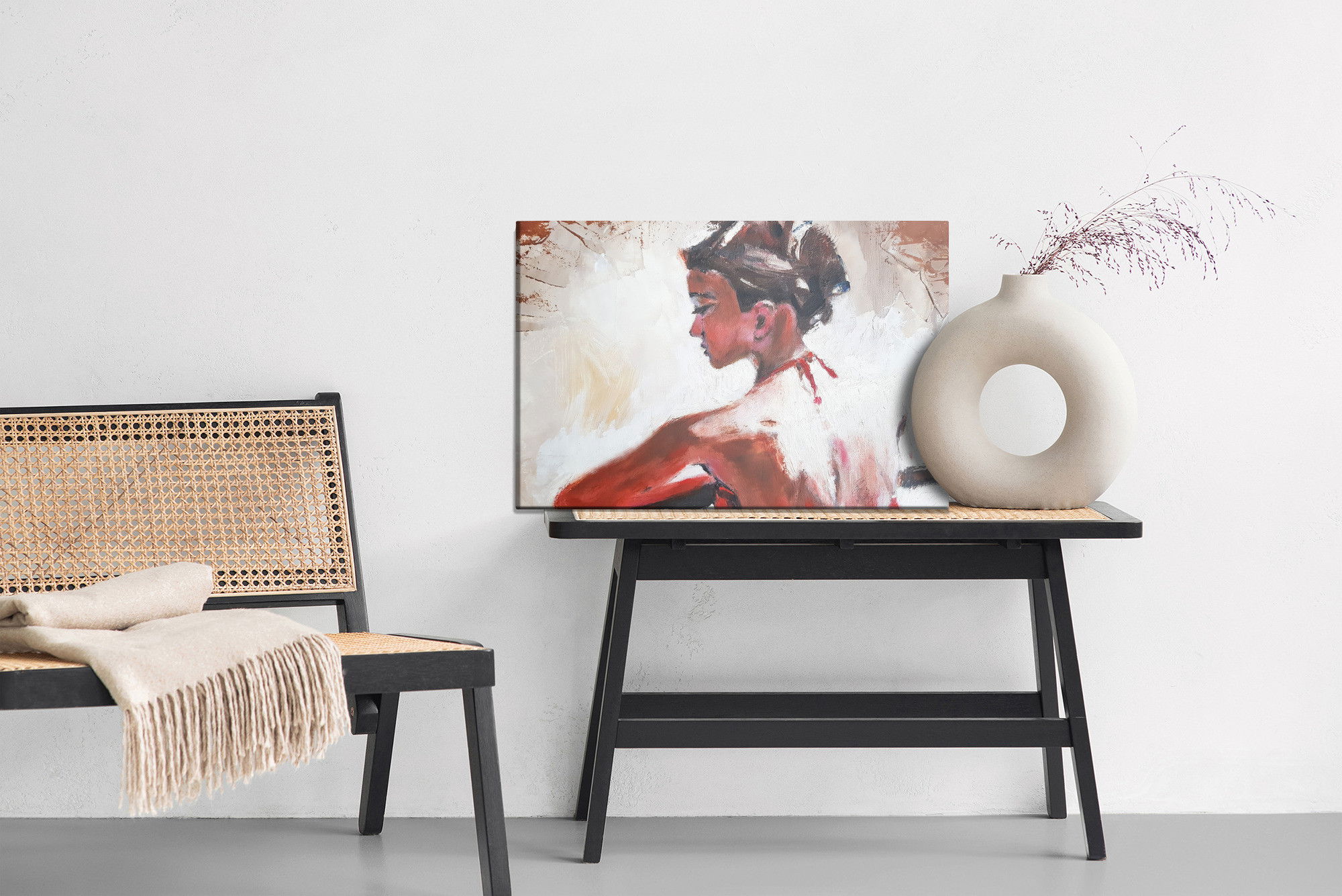 Varje tavla monteras på en massiv fururam. Format upp till 70×50 cm har en ram på 15 mm, medan format från 90×60 cm och uppåt har en ram på 20 mm. Den exakta dukspänningen gör att tavlan håller sin form över tid. Motivet Pensive woman trycks runt hela ramen vilket ger ett stilrent galleriuttryck där tavlan är lika vacker från sidan som framifrån. Kombinationen av rak dukspänning, rena linjer och korrekt tryck ger en professionell finish.
