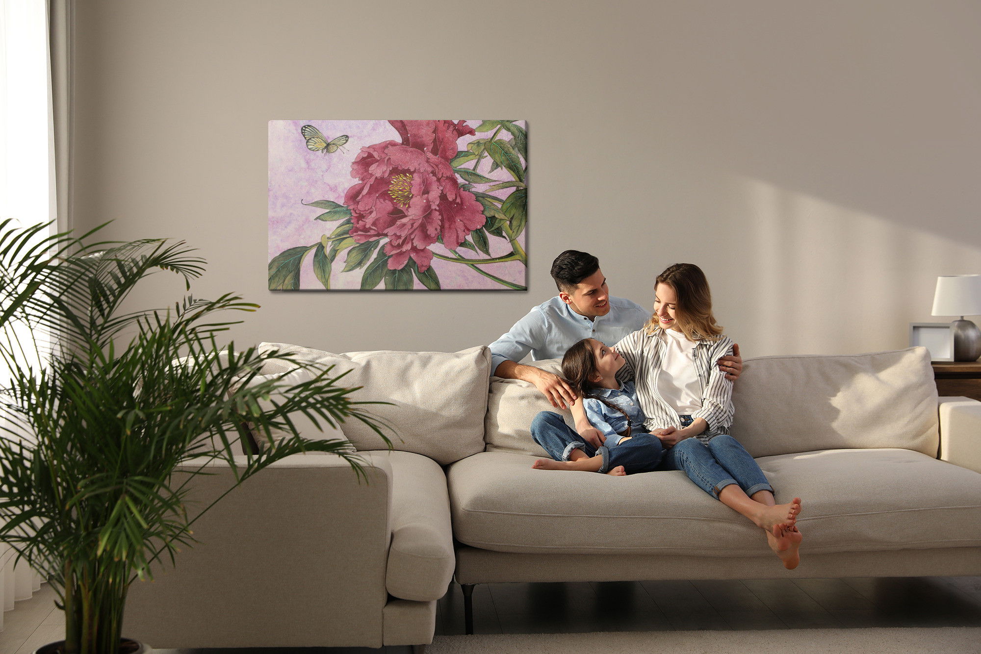 Motivet Peonies and butterflies återges med hög färgprecision och detaljrikedom tack vare HP Latex-teknologi. Trycket sker med vattenbaserade, luktfria och GREENGUARD Gold-certifierade bläck som ger en upplösning på upp till 300 DPI. Färgerna är UV-beständiga och behåller sin styrka även i ljusa rum, vilket gör tavlan lämplig för både hem- och offentliga miljöer.