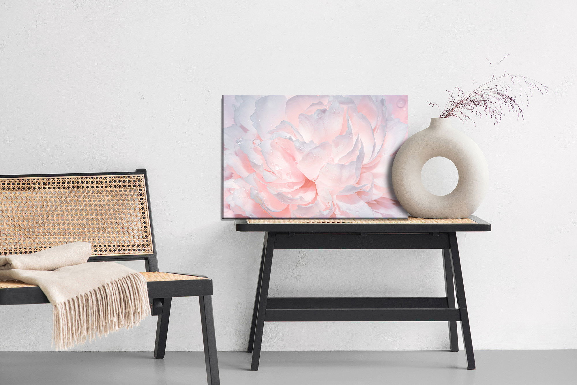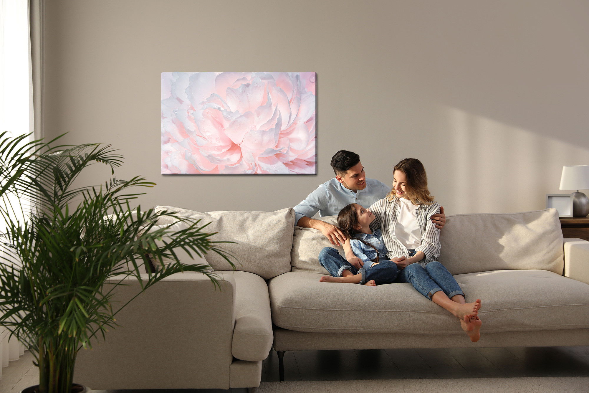 Motivet Peonies in drops of water återges med hög färgprecision och detaljrikedom tack vare HP Latex-teknologi. Trycket sker med vattenbaserade, luktfria och GREENGUARD Gold-certifierade bläck som ger en upplösning på upp till 300 DPI. Färgerna är UV-beständiga och behåller sin styrka även i ljusa rum, vilket gör tavlan lämplig för både hem- och offentliga miljöer.