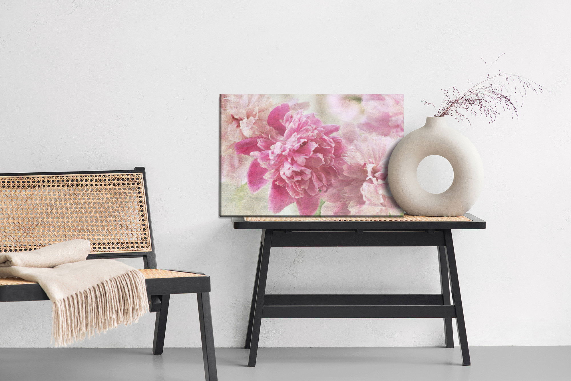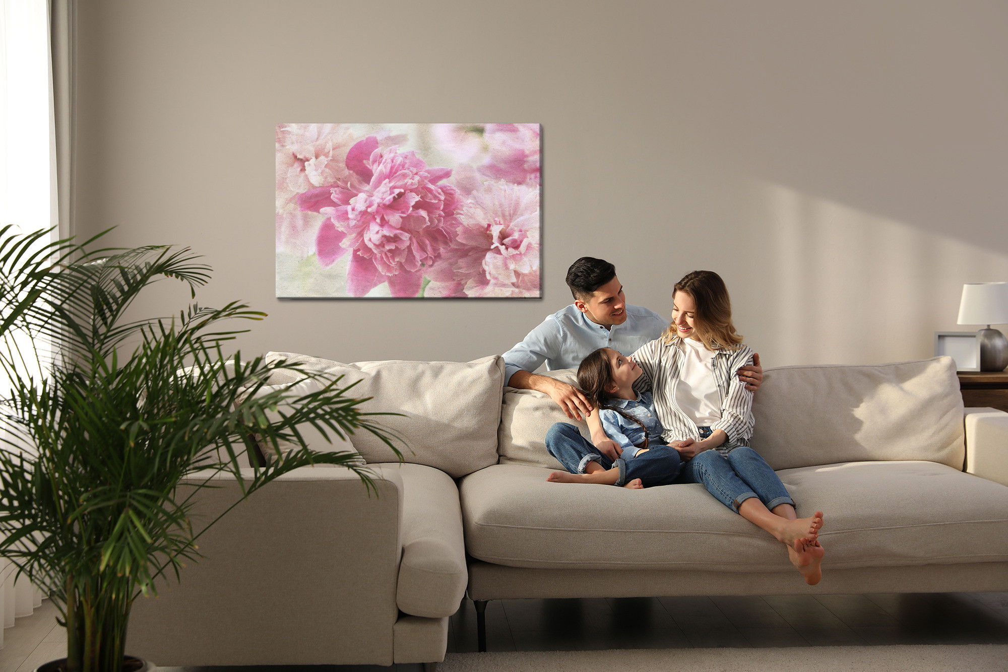 Varje tavla monteras på en massiv fururam. Format upp till 70×50 cm har en ram på 15 mm, medan format från 90×60 cm och uppåt har en ram på 20 mm. Den exakta dukspänningen gör att tavlan håller sin form över tid. Motivet Peonies in retro style trycks runt hela ramen vilket ger ett stilrent galleriuttryck där tavlan är lika vacker från sidan som framifrån. Kombinationen av rak dukspänning, rena linjer och korrekt tryck ger en professionell finish.