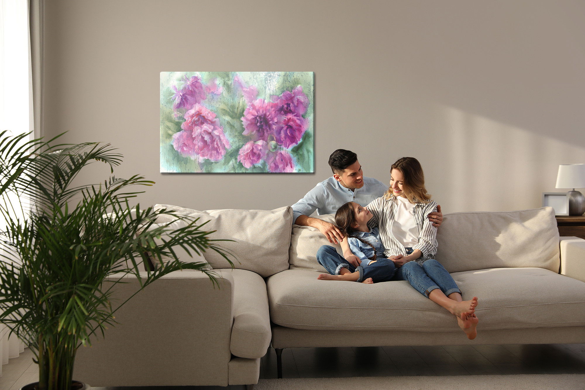 Varje tavla monteras på en massiv fururam. Format upp till 70×50 cm har en ram på 15 mm, medan format från 90×60 cm och uppåt har en ram på 20 mm. Den exakta dukspänningen gör att tavlan håller sin form över tid. Motivet Peonies in watercolor trycks runt hela ramen vilket ger ett stilrent galleriuttryck där tavlan är lika vacker från sidan som framifrån. Kombinationen av rak dukspänning, rena linjer och korrekt tryck ger en professionell finish.