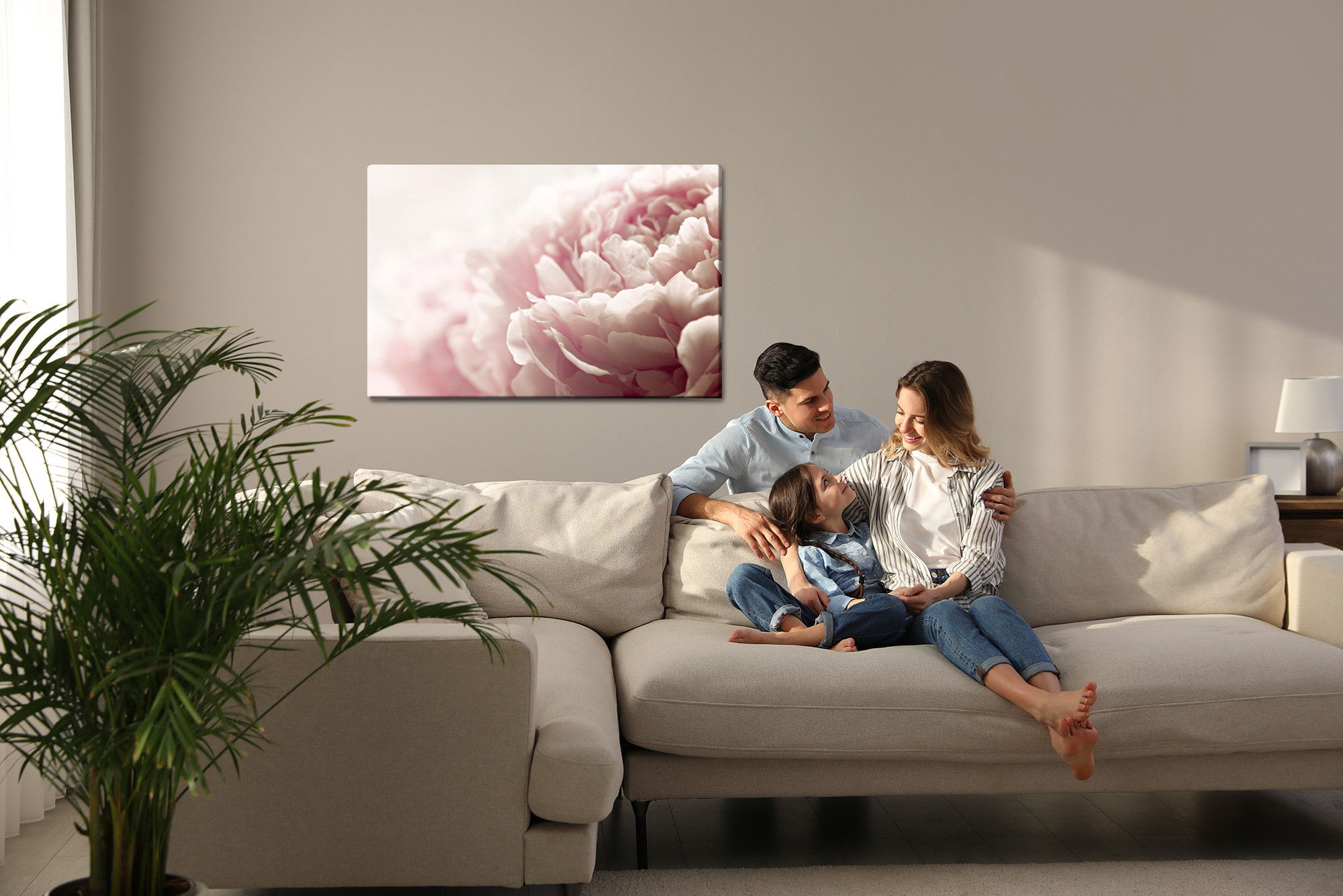 Varje tavla monteras på en massiv fururam. Format upp till 70×50 cm har en ram på 15 mm, medan format från 90×60 cm och uppåt har en ram på 20 mm. Den exakta dukspänningen gör att tavlan håller sin form över tid. Motivet Peonies roses in pastel trycks runt hela ramen vilket ger ett stilrent galleriuttryck där tavlan är lika vacker från sidan som framifrån. Kombinationen av rak dukspänning, rena linjer och korrekt tryck ger en professionell finish.