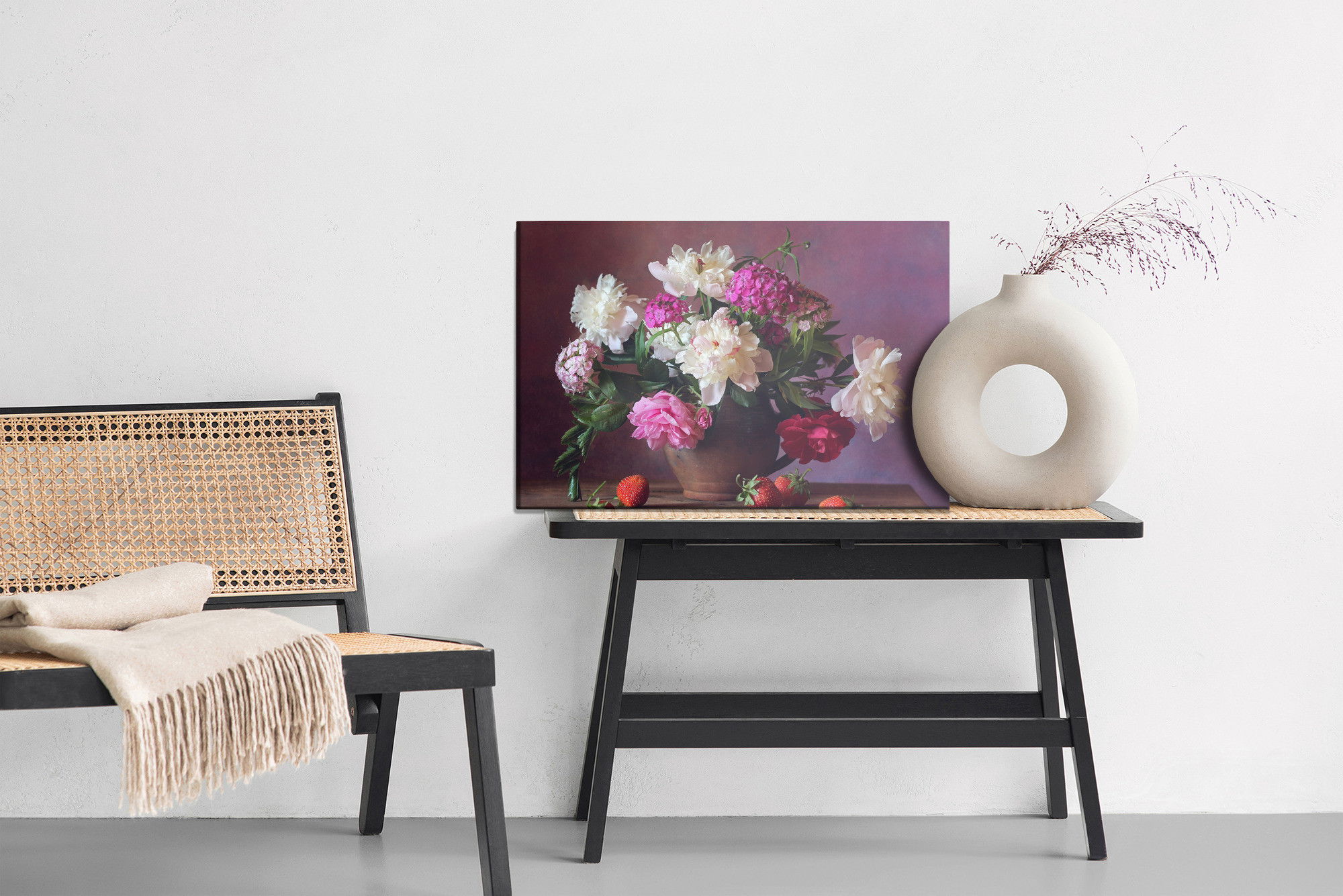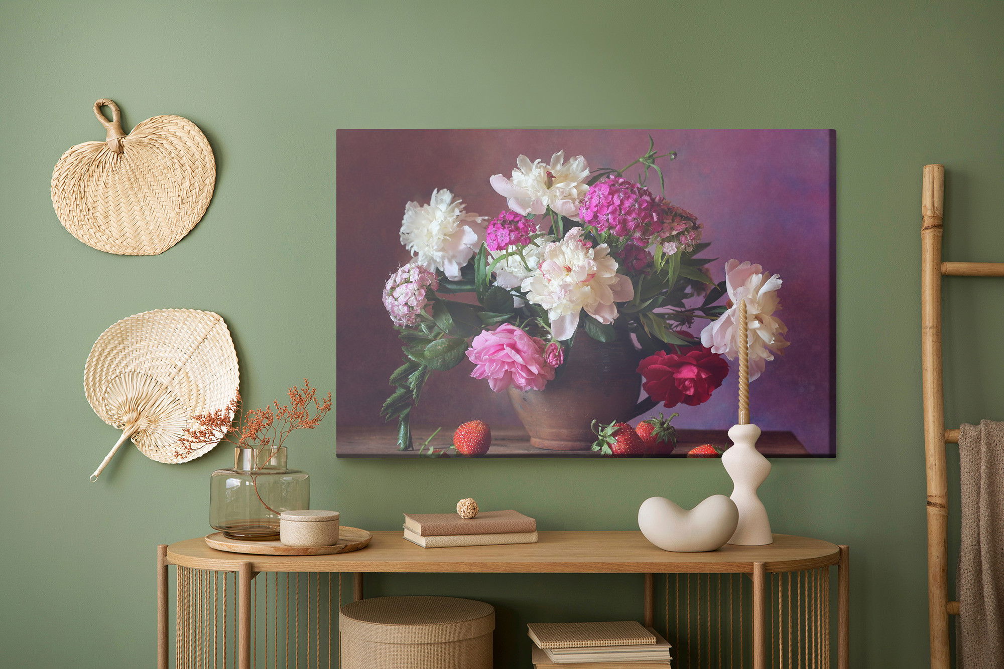 Ljuddämpande tavla – Peonies with fruit för lugnare rum och mjukare akustik