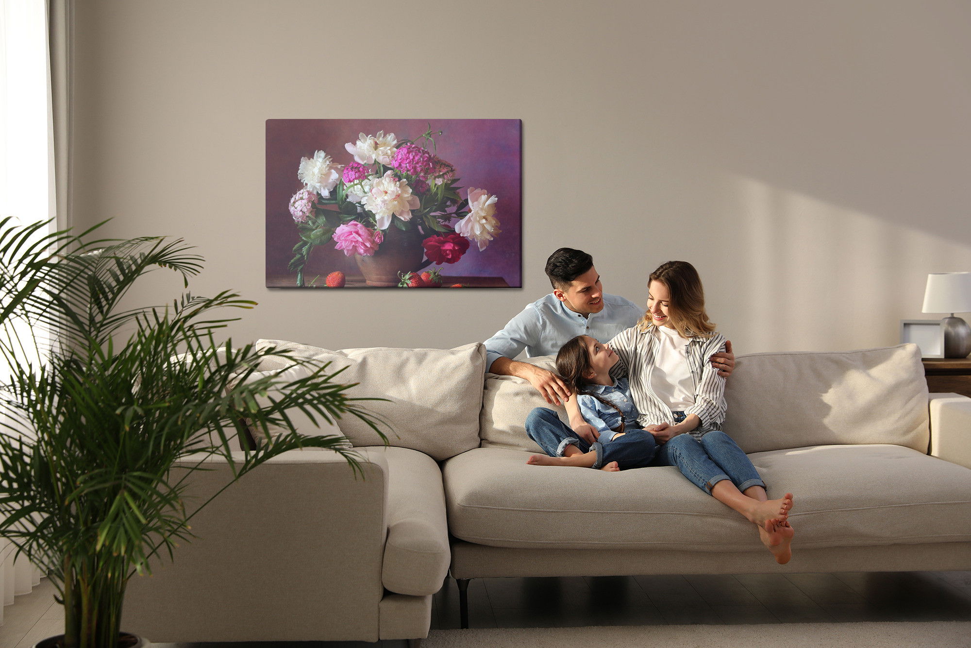 Varje tavla monteras på en massiv fururam. Format upp till 70×50 cm har en ram på 15 mm, medan format från 90×60 cm och uppåt har en ram på 20 mm. Den exakta dukspänningen gör att tavlan håller sin form över tid. Motivet Peonies with fruit trycks runt hela ramen vilket ger ett stilrent galleriuttryck där tavlan är lika vacker från sidan som framifrån. Kombinationen av rak dukspänning, rena linjer och korrekt tryck ger en professionell finish.