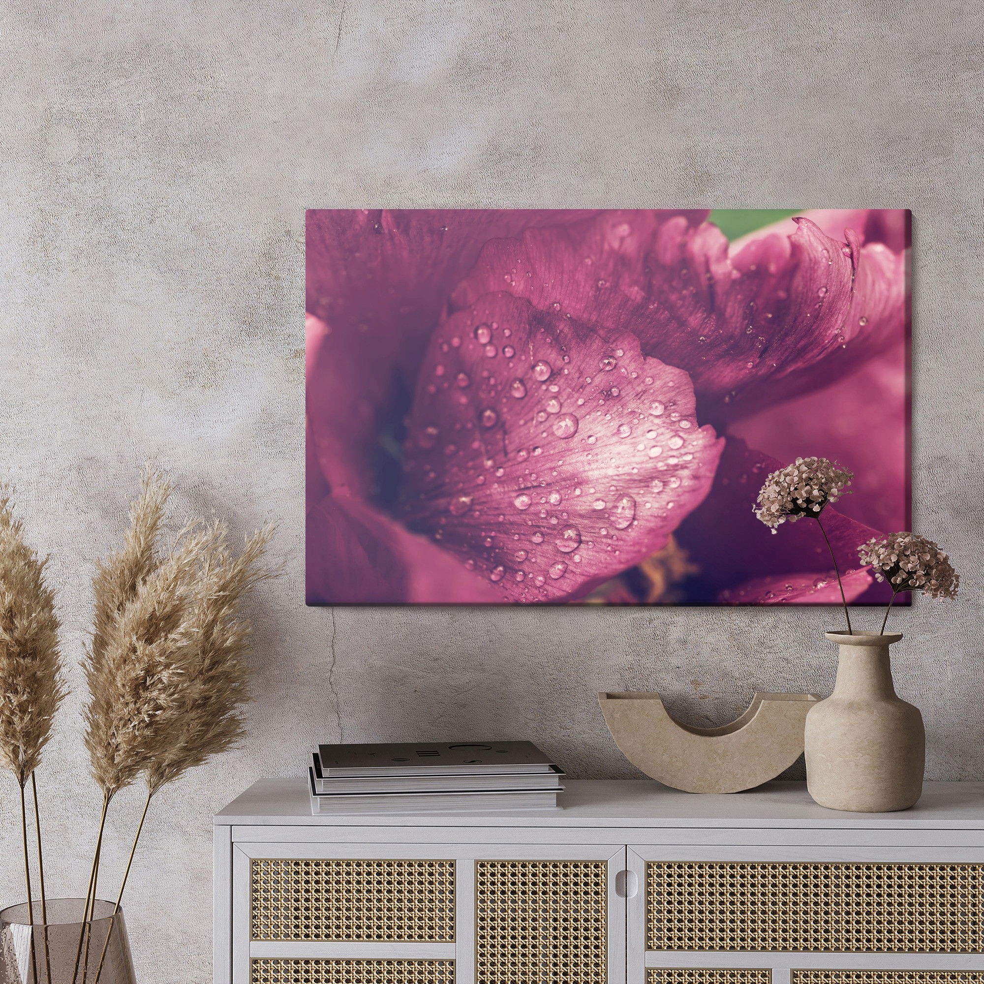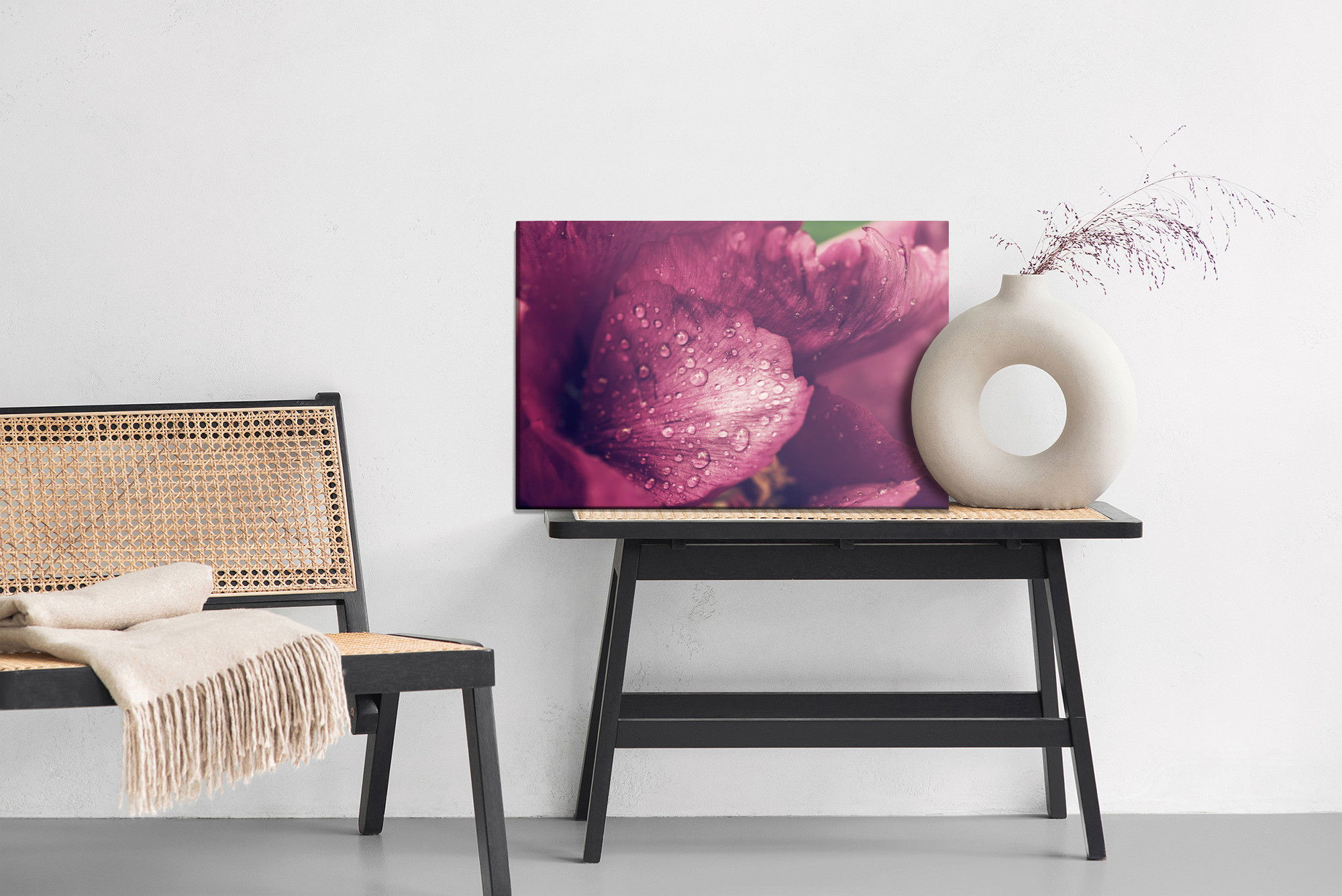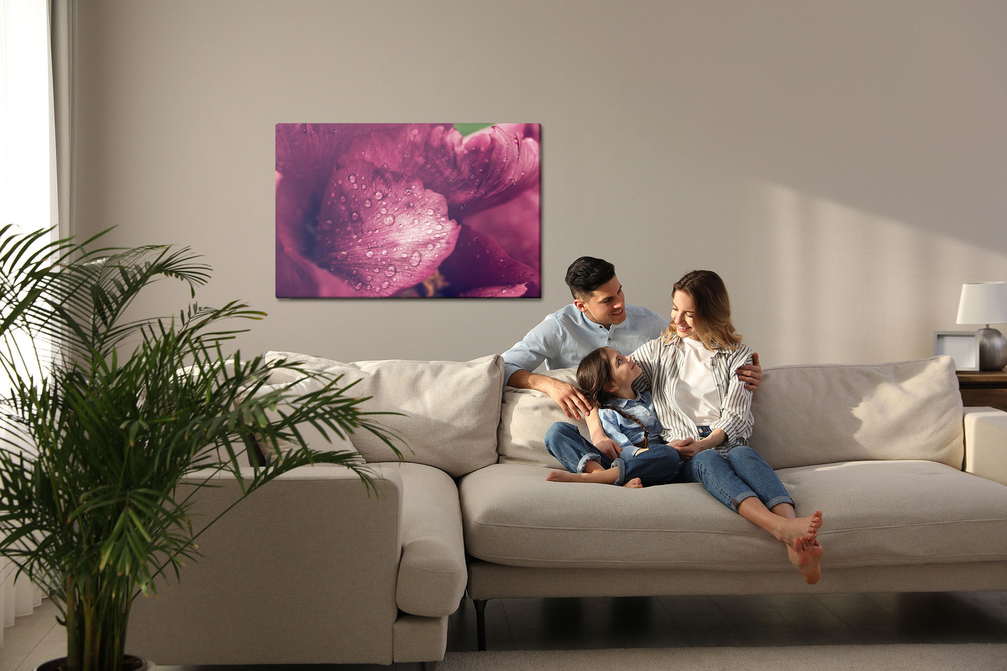 Varje tavla monteras på en massiv fururam. Format upp till 70×50 cm har en ram på 15 mm, medan format från 90×60 cm och uppåt har en ram på 20 mm. Den exakta dukspänningen gör att tavlan håller sin form över tid. Motivet Peony roses with dew trycks runt hela ramen vilket ger ett stilrent galleriuttryck där tavlan är lika vacker från sidan som framifrån. Kombinationen av rak dukspänning, rena linjer och korrekt tryck ger en professionell finish.