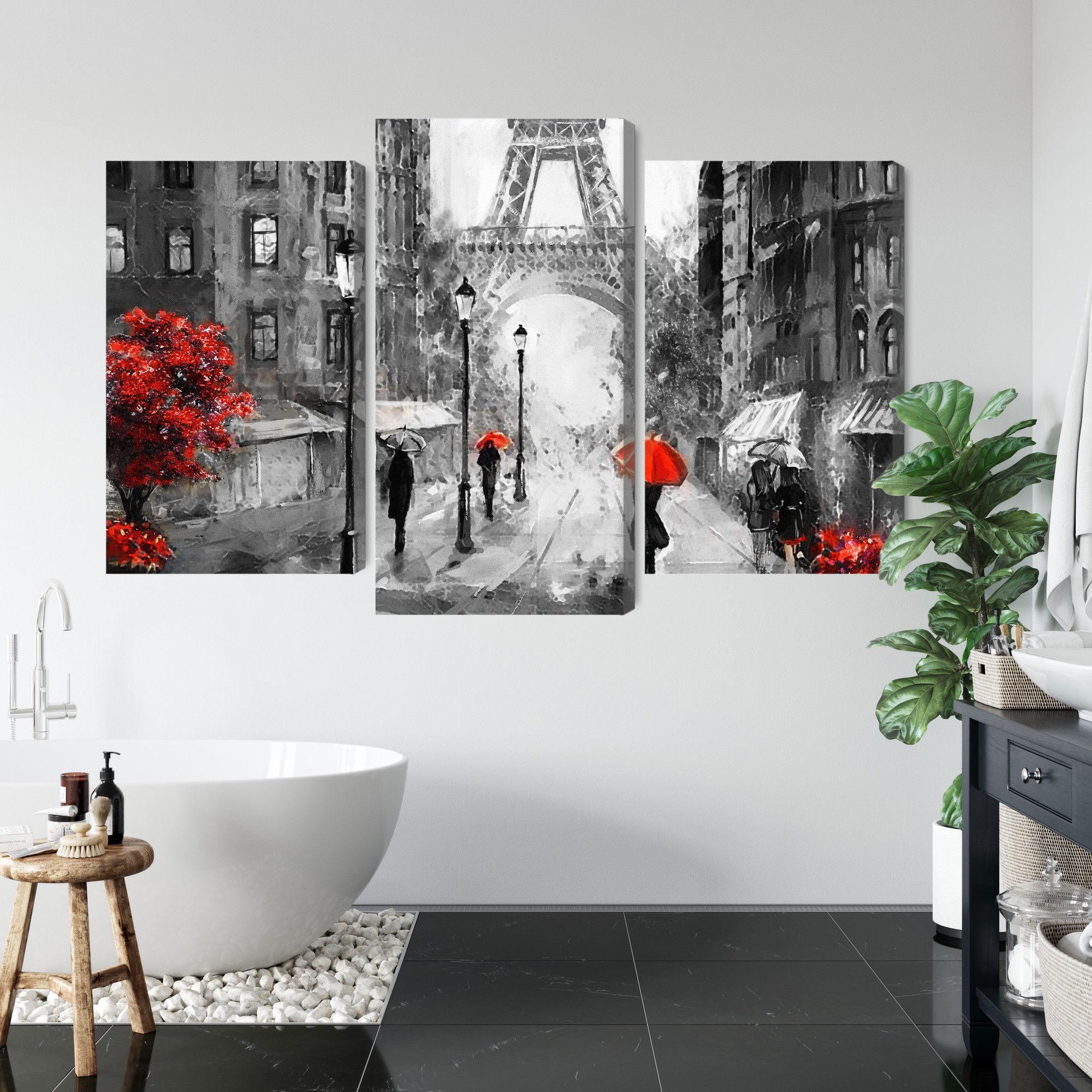 Varje tavla monteras på en massiv fururam. Format upp till 70×50 cm har en ram på 15 mm, medan format från 90×60 cm och uppåt har en ram på 20 mm. Den exakta dukspänningen gör att tavlan håller sin form över tid. Motivet People with red umbrellas trycks runt hela ramen vilket ger ett stilrent galleriuttryck där tavlan är lika vacker från sidan som framifrån. Kombinationen av rak dukspänning, rena linjer och korrekt tryck ger en professionell finish.