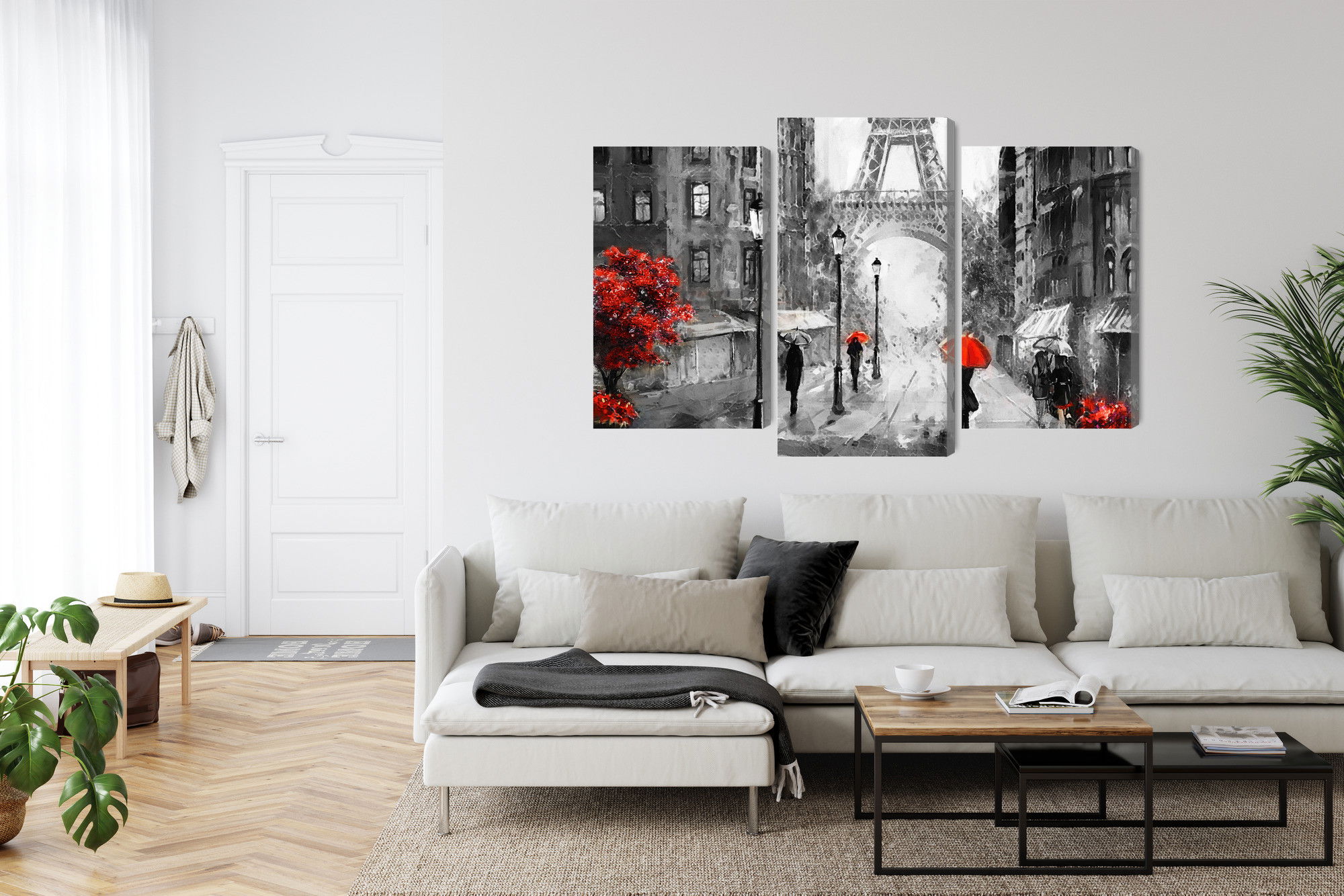 SilentDirects ljuddämpande tavla People with red umbrellas kombinerar ett högupplöst motiv med avancerad akustikteknik. Varje tavla monteras i Sverige och bygger på en stabil canvastavla med fururam, där insidan av ramen fylls med en ljudabsorberande kärna av återvunnen polyester. Konstruktionen gör tavlan till ett både estetiskt och funktionellt inslag i rummet.