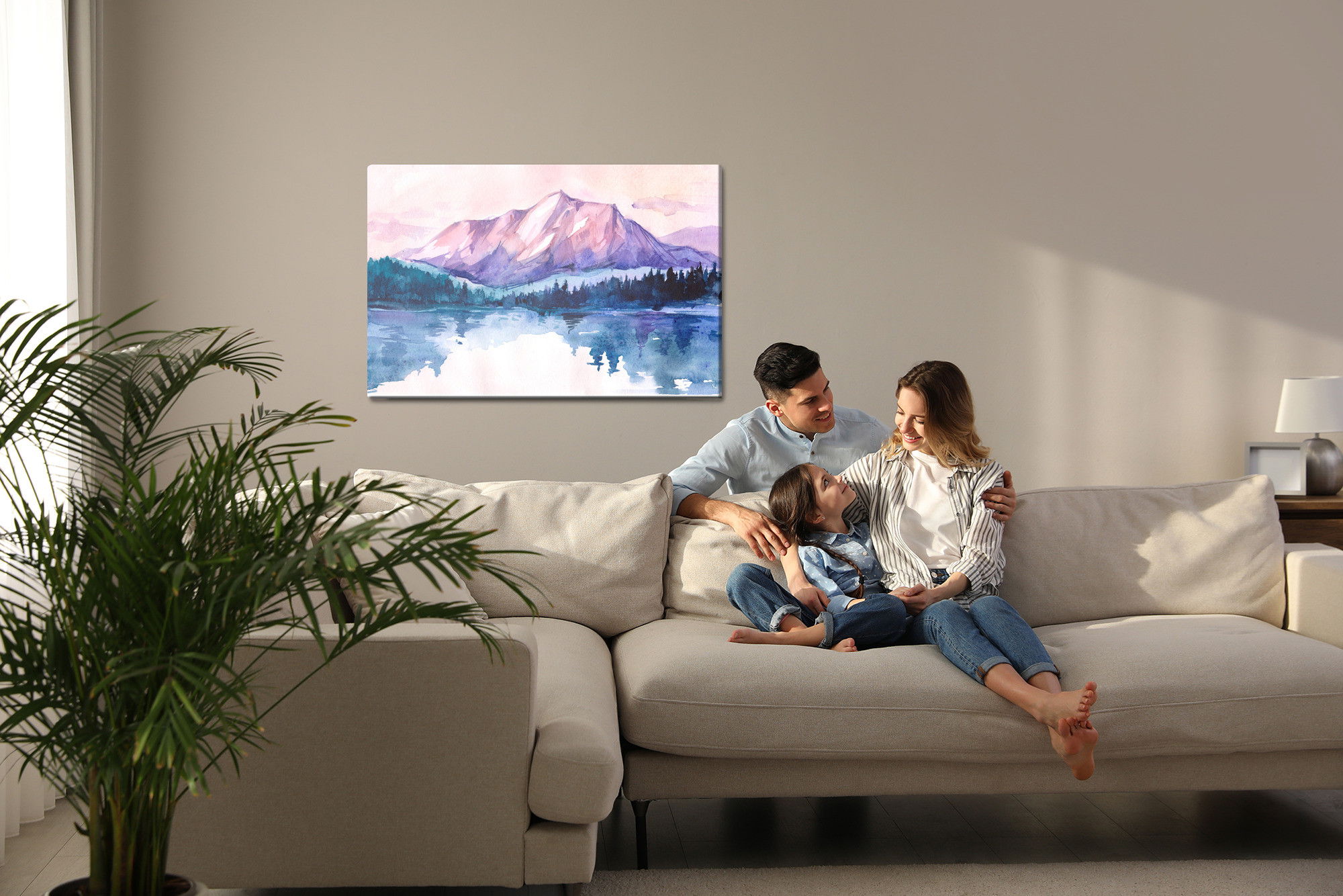 Varje tavla monteras på en massiv fururam. Format upp till 70×50 cm har en ram på 15 mm, medan format från 90×60 cm och uppåt har en ram på 20 mm. Den exakta dukspänningen gör att tavlan håller sin form över tid. Motivet Picturesque mountain trycks runt hela ramen vilket ger ett stilrent galleriuttryck där tavlan är lika vacker från sidan som framifrån. Kombinationen av rak dukspänning, rena linjer och korrekt tryck ger en professionell finish.