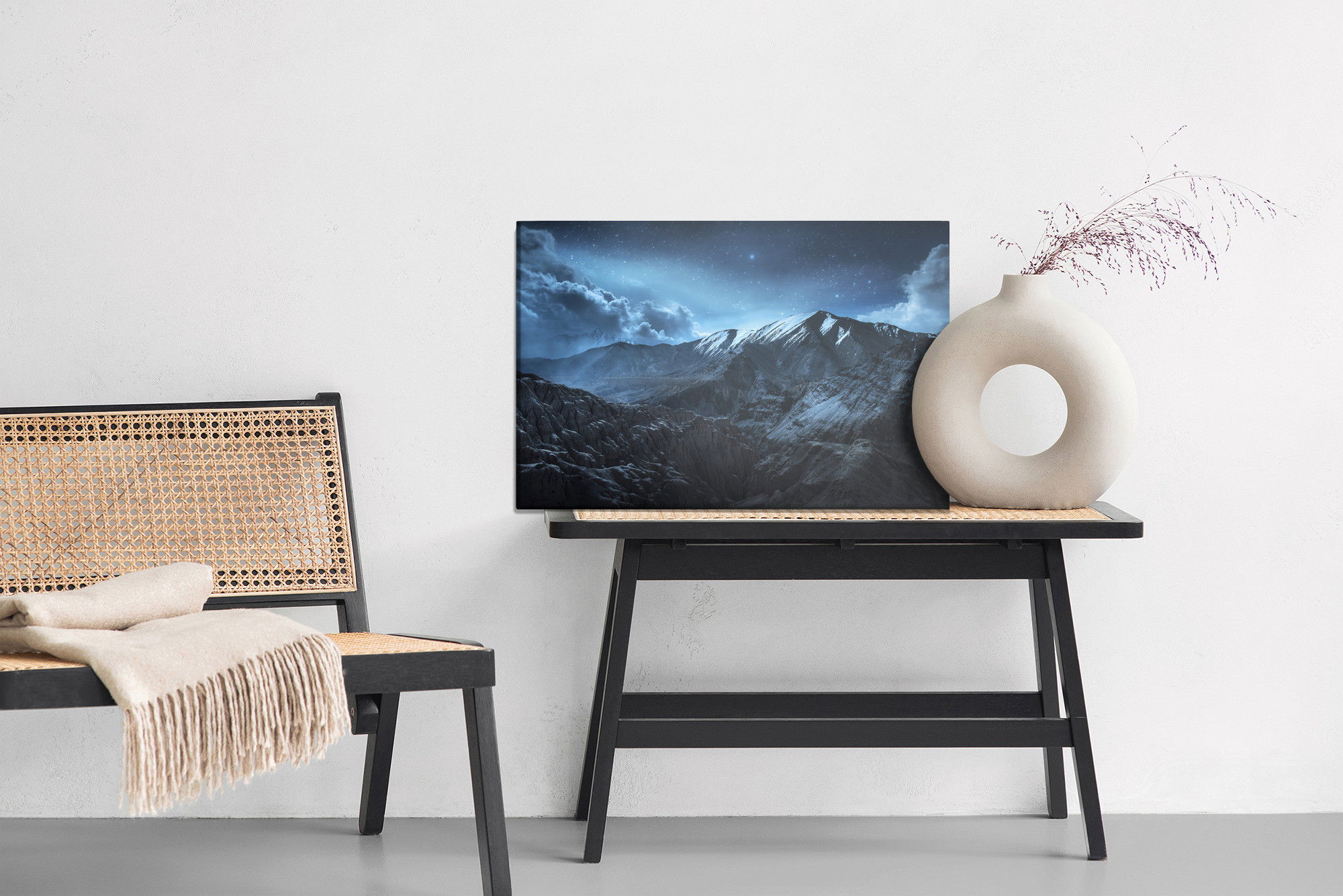 Varje tavla monteras på en massiv fururam. Format upp till 70×50 cm har en ram på 15 mm, medan format från 90×60 cm och uppåt har en ram på 20 mm. Den exakta dukspänningen gör att tavlan håller sin form över tid. Motivet trycks runt hela ramen vilket ger ett stilrent galleriuttryck där tavlan är lika vacker från sidan som framifrån. Kombinationen av rak dukspänning, rena linjer och korrekt tryck ger en professionell finish.