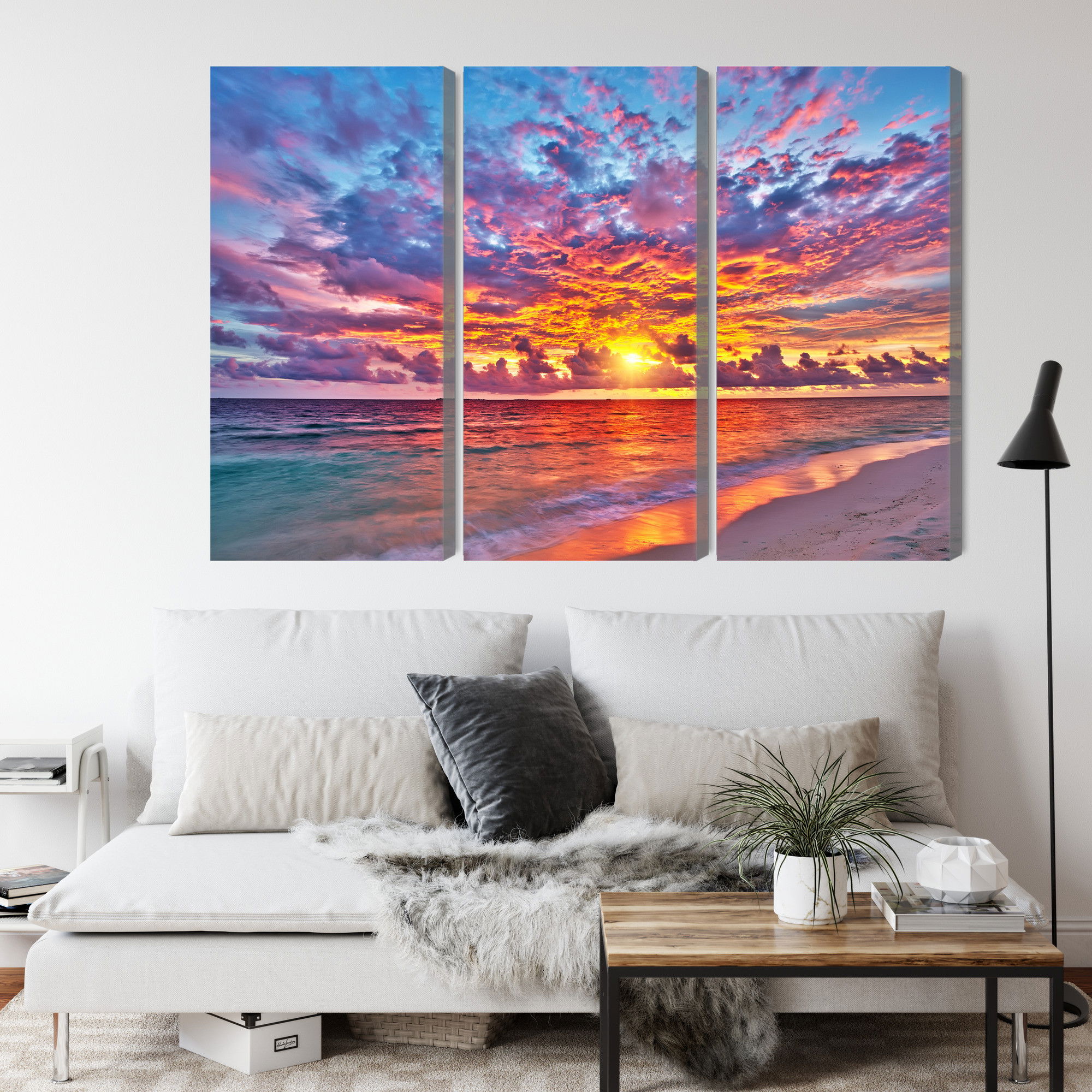 Varje tavla monteras på en massiv fururam. Format upp till 70×50 cm har en ram på 15 mm, medan format från 90×60 cm och uppåt har en ram på 20 mm. Den exakta dukspänningen gör att tavlan håller sin form över tid. Motivet Picturesque sunset trycks runt hela ramen vilket ger ett stilrent galleriuttryck där tavlan är lika vacker från sidan som framifrån. Kombinationen av rak dukspänning, rena linjer och korrekt tryck ger en professionell finish.