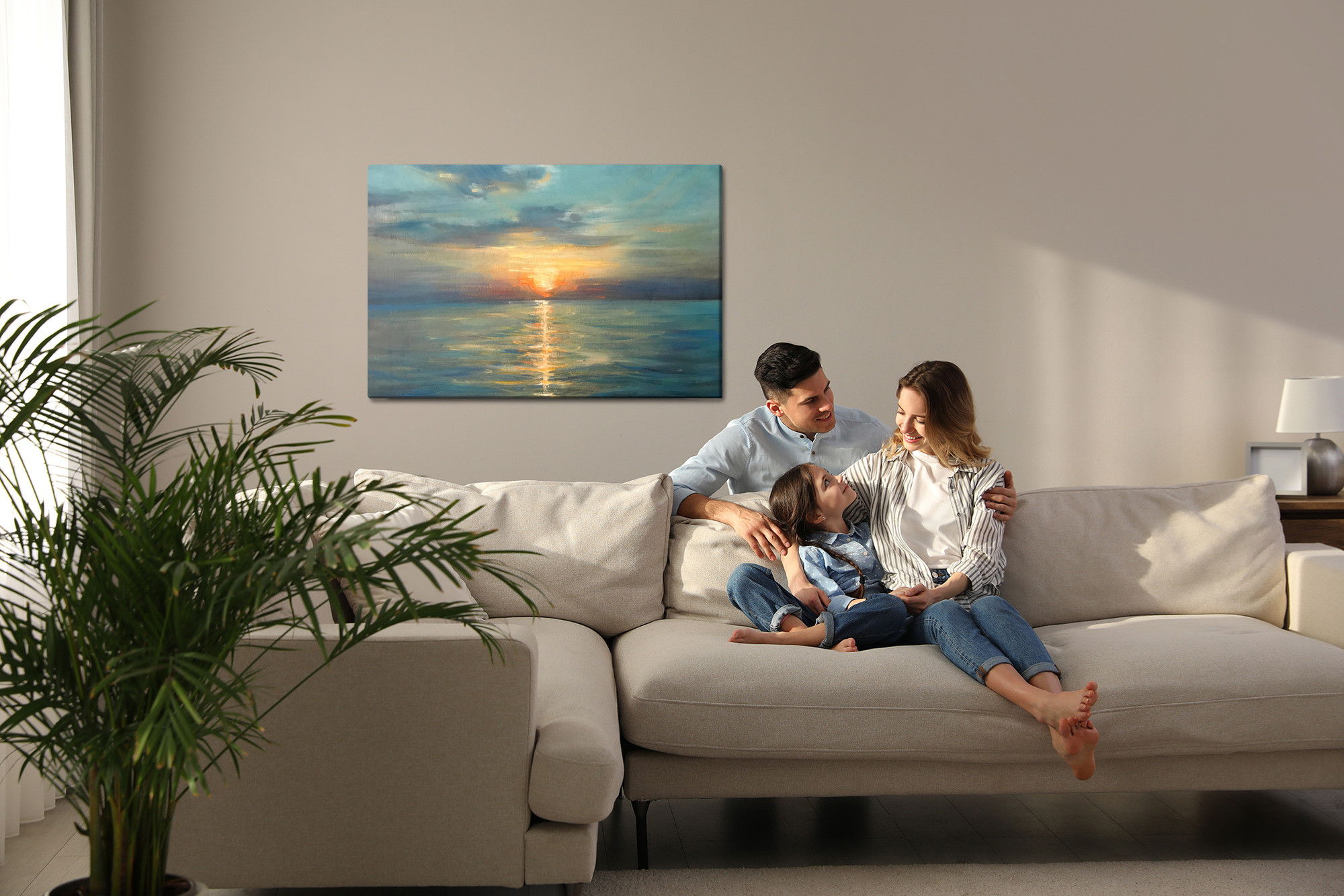 Varje tavla monteras på en massiv fururam. Format upp till 70×50 cm har en ram på 15 mm, medan format från 90×60 cm och uppåt har en ram på 20 mm. Den exakta dukspänningen gör att tavlan håller sin form över tid. Motivet Picturesque sunset by the sea trycks runt hela ramen vilket ger ett stilrent galleriuttryck där tavlan är lika vacker från sidan som framifrån. Kombinationen av rak dukspänning, rena linjer och korrekt tryck ger en professionell finish.