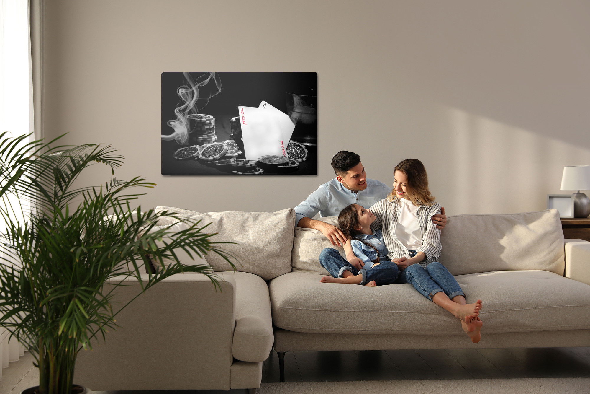 Varje tavla monteras på en massiv fururam. Format upp till 70×50 cm har en ram på 15 mm, medan format från 90×60 cm och uppåt har en ram på 20 mm. Den exakta dukspänningen gör att tavlan håller sin form över tid. Motivet Poker set trycks runt hela ramen vilket ger ett stilrent galleriuttryck där tavlan är lika vacker från sidan som framifrån. Kombinationen av rak dukspänning, rena linjer och korrekt tryck ger en professionell finish.