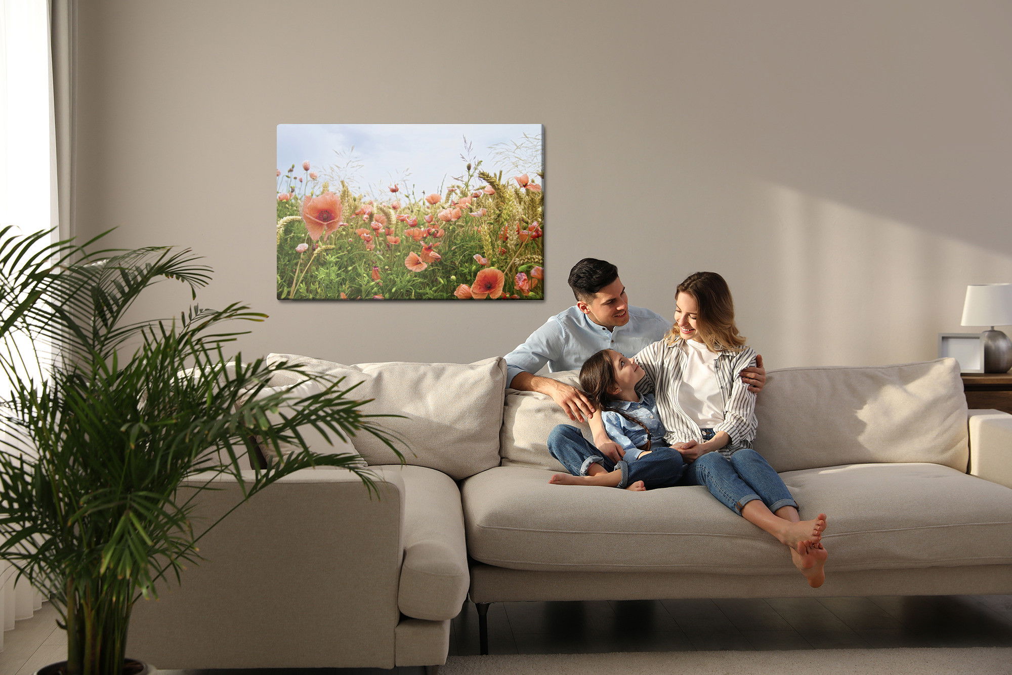 Motivet Poppies in the meadow återges med hög färgprecision och detaljrikedom tack vare HP Latex-teknologi. Trycket sker med vattenbaserade, luktfria och GREENGUARD Gold-certifierade bläck som ger en upplösning på upp till 300 DPI. Färgerna är UV-beständiga och behåller sin styrka även i ljusa rum, vilket gör tavlan lämplig för både hem- och offentliga miljöer.