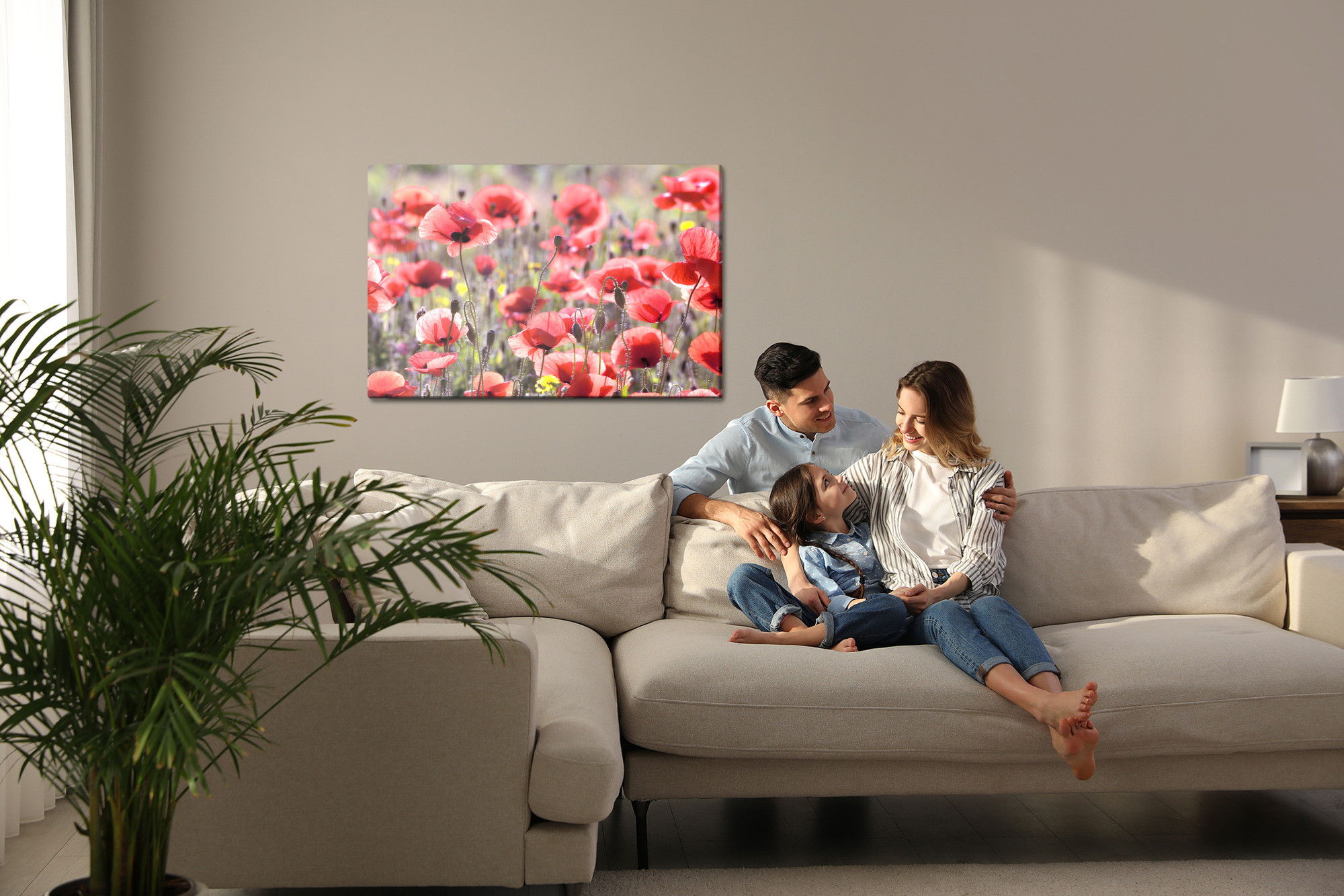 Motivet Poppies in the sun återges med hög färgprecision och detaljrikedom tack vare HP Latex-teknologi. Trycket sker med vattenbaserade, luktfria och GREENGUARD Gold-certifierade bläck som ger en upplösning på upp till 300 DPI. Färgerna är UV-beständiga och behåller sin styrka även i ljusa rum, vilket gör tavlan lämplig för både hem- och offentliga miljöer.