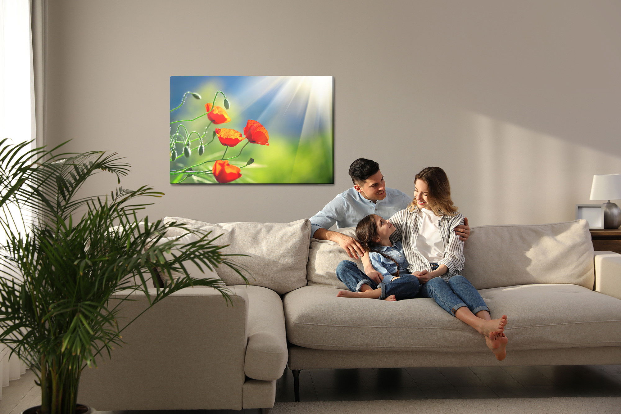 Motivet Poppies in the sunshine återges med hög färgprecision och detaljrikedom tack vare HP Latex-teknologi. Trycket sker med vattenbaserade, luktfria och GREENGUARD Gold-certifierade bläck som ger en upplösning på upp till 300 DPI. Färgerna är UV-beständiga och behåller sin styrka även i ljusa rum, vilket gör tavlan lämplig för både hem- och offentliga miljöer.