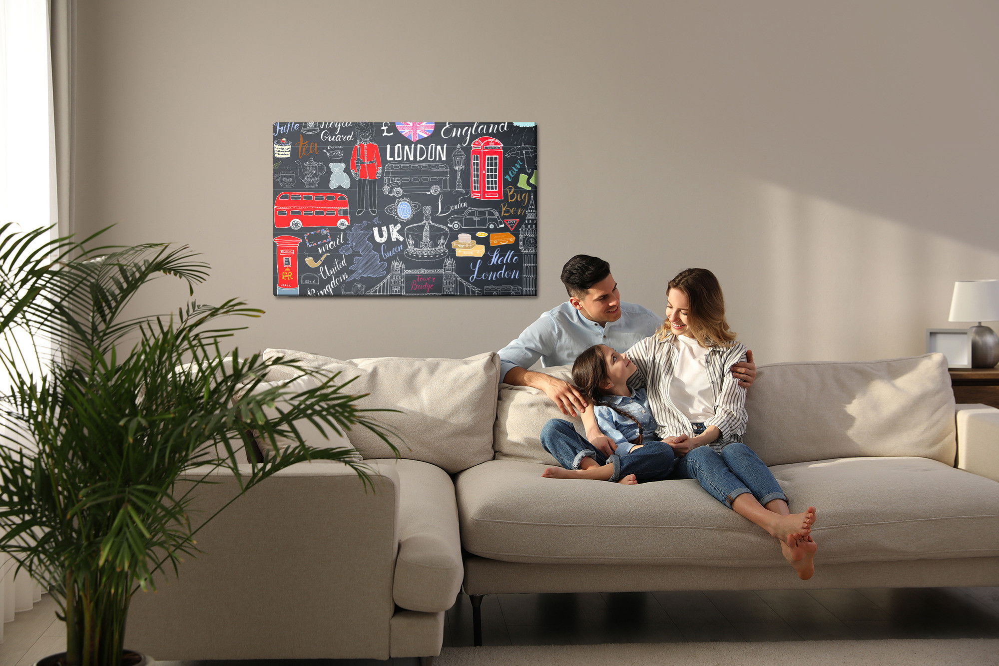 Varje tavla monteras på en massiv fururam. Format upp till 70×50 cm har en ram på 15 mm, medan format från 90×60 cm och uppåt har en ram på 20 mm. Den exakta dukspänningen gör att tavlan håller sin form över tid. Motivet Popular symbols of London trycks runt hela ramen vilket ger ett stilrent galleriuttryck där tavlan är lika vacker från sidan som framifrån. Kombinationen av rak dukspänning, rena linjer och korrekt tryck ger en professionell finish.