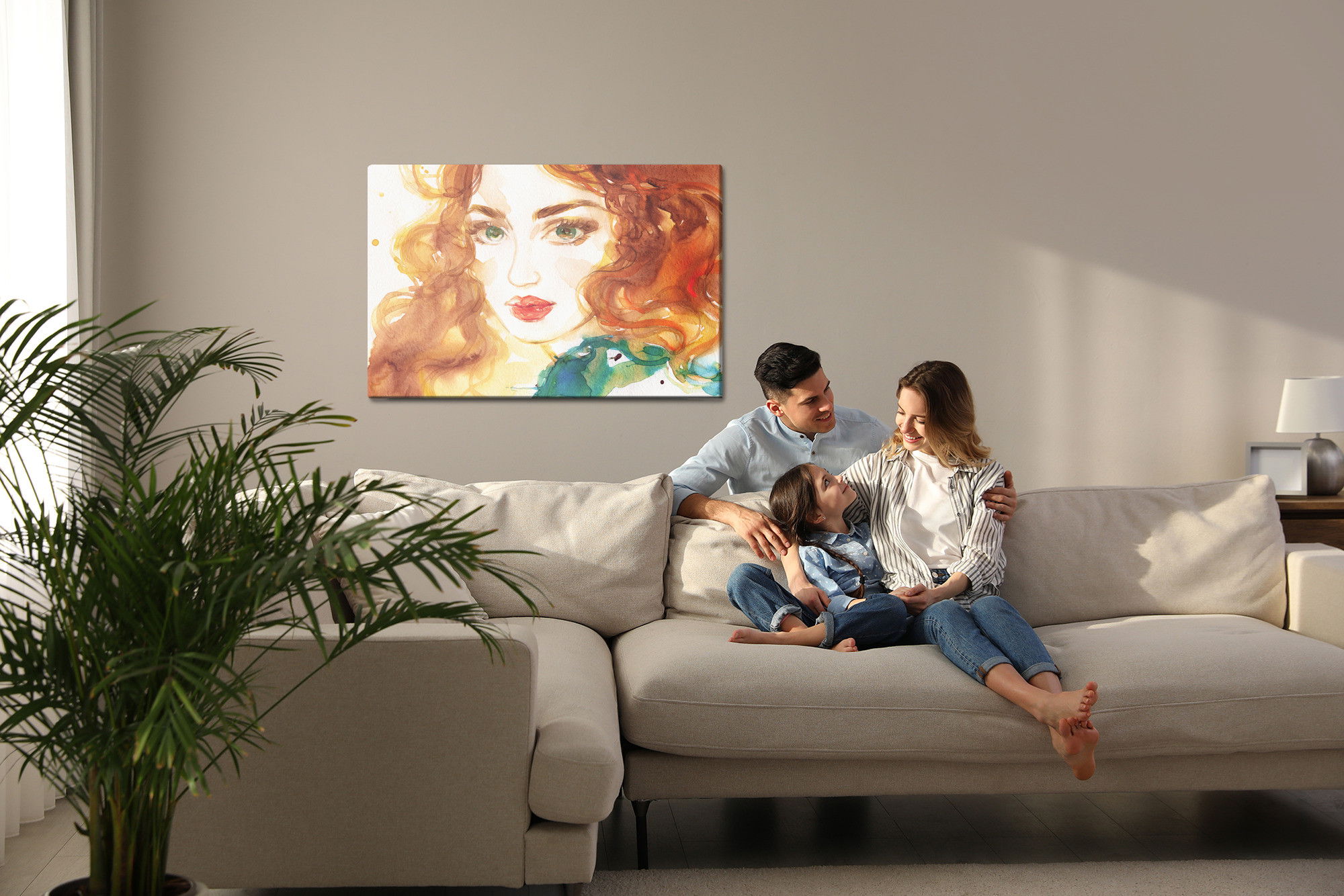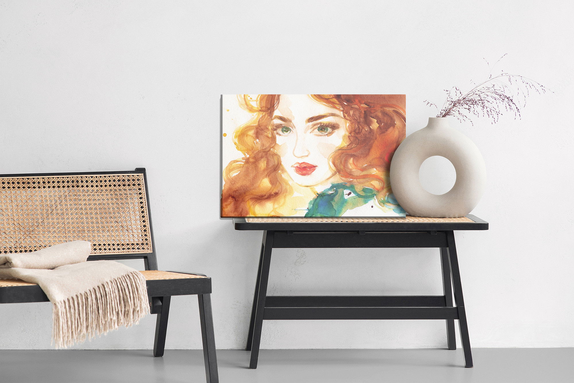 Motivet Portrait of a red-haired återges med hög färgprecision och detaljrikedom tack vare HP Latex-teknologi. Trycket sker med vattenbaserade, luktfria och GREENGUARD Gold-certifierade bläck som ger en upplösning på upp till 300 DPI. Färgerna är UV-beständiga och behåller sin styrka även i ljusa rum, vilket gör tavlan lämplig för både hem- och offentliga miljöer.