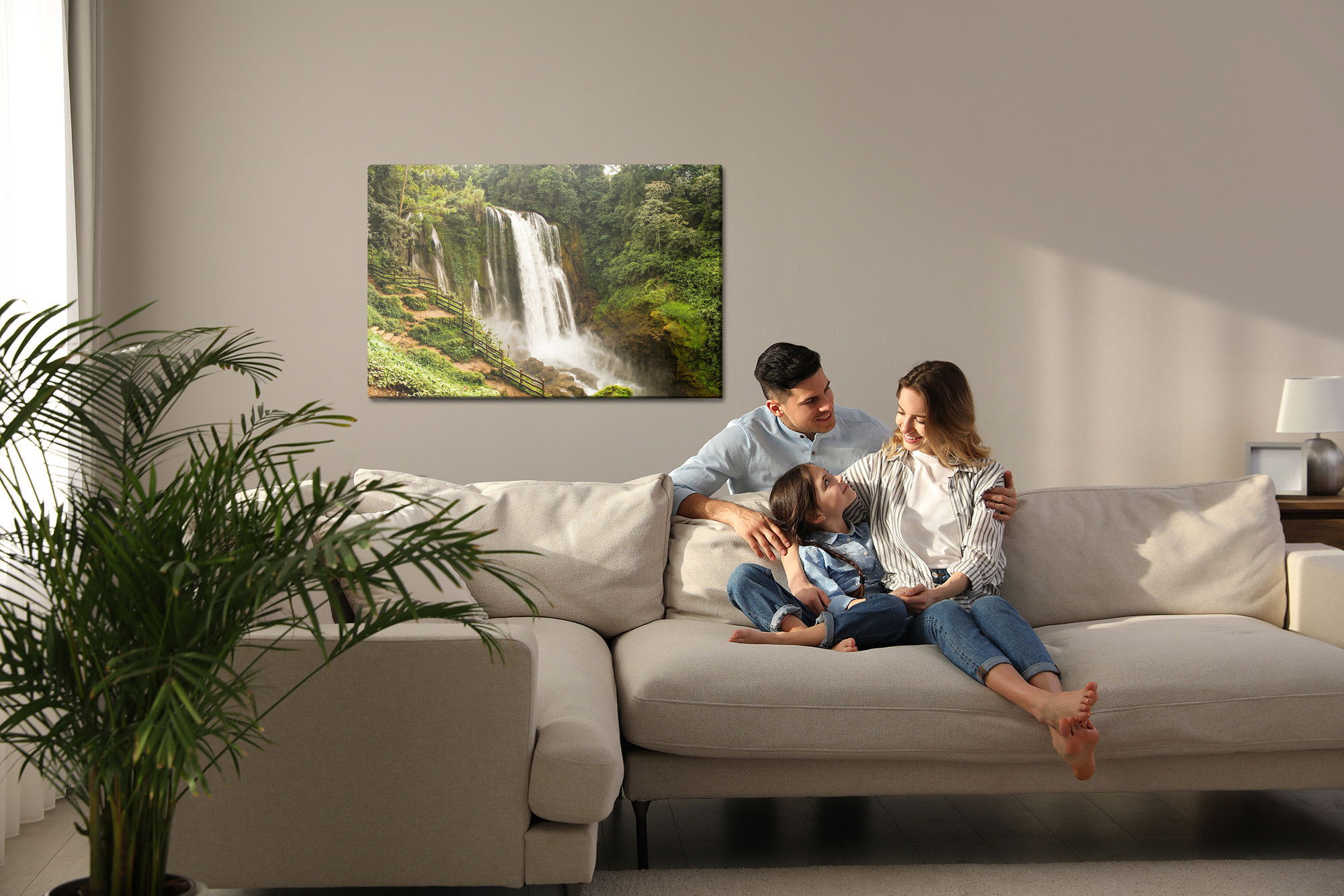 Varje tavla monteras på en massiv fururam. Format upp till 70×50 cm har en ram på 15 mm, medan format från 90×60 cm och uppåt har en ram på 20 mm. Den exakta dukspänningen gör att tavlan håller sin form över tid. Motivet Pulhapanzak waterfall trycks runt hela ramen vilket ger ett stilrent galleriuttryck där tavlan är lika vacker från sidan som framifrån. Kombinationen av rak dukspänning, rena linjer och korrekt tryck ger en professionell finish.