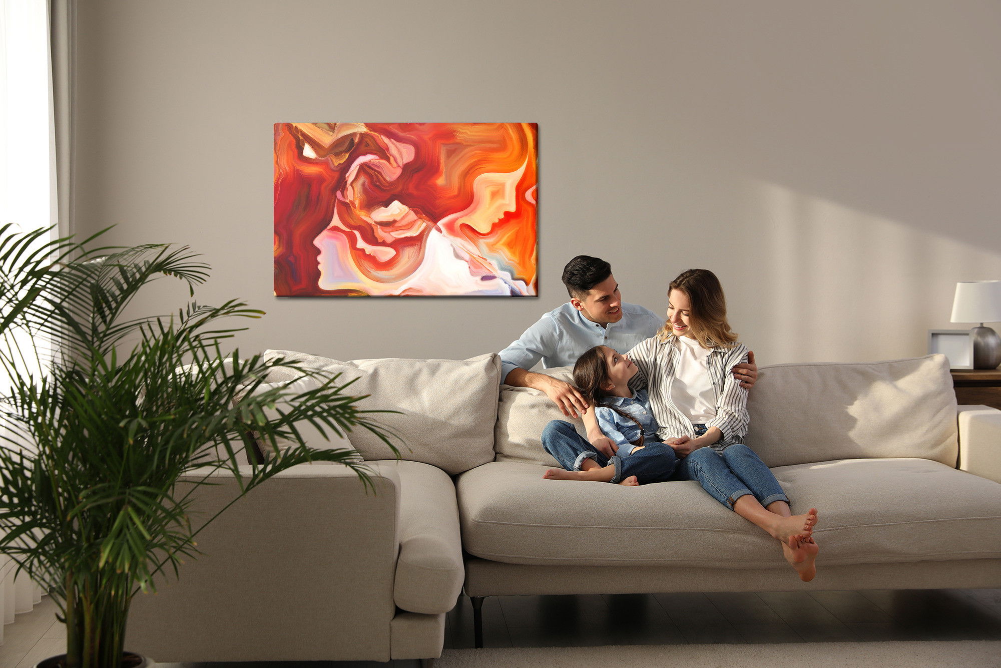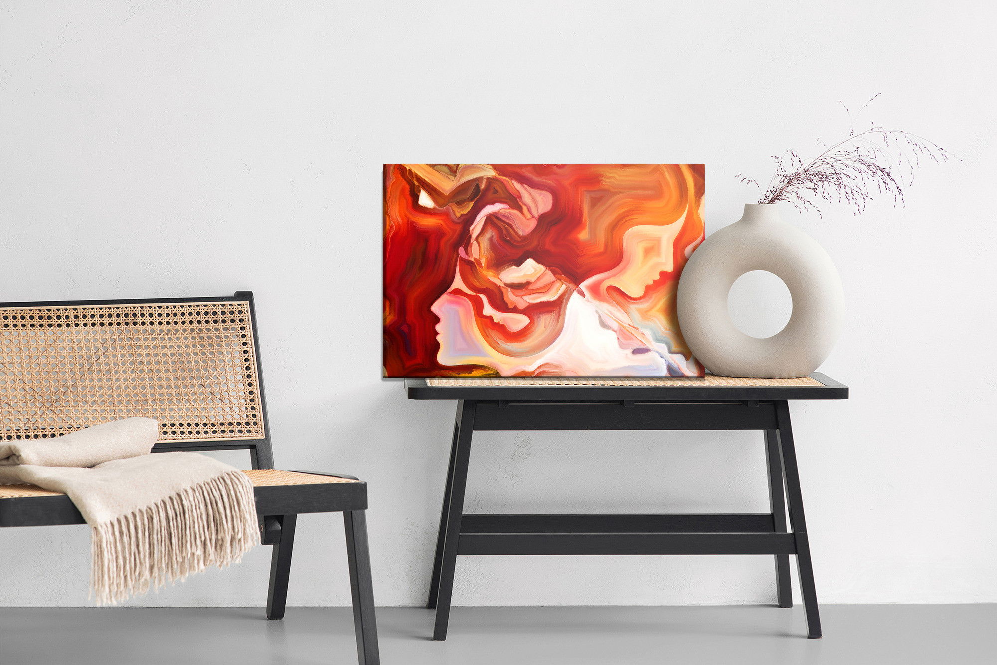 Varje tavla monteras på en massiv fururam. Format upp till 70×50 cm har en ram på 15 mm, medan format från 90×60 cm och uppåt har en ram på 20 mm. Den exakta dukspänningen gör att tavlan håller sin form över tid. Motivet Red abstraction with face trycks runt hela ramen vilket ger ett stilrent galleriuttryck där tavlan är lika vacker från sidan som framifrån. Kombinationen av rak dukspänning, rena linjer och korrekt tryck ger en professionell finish.