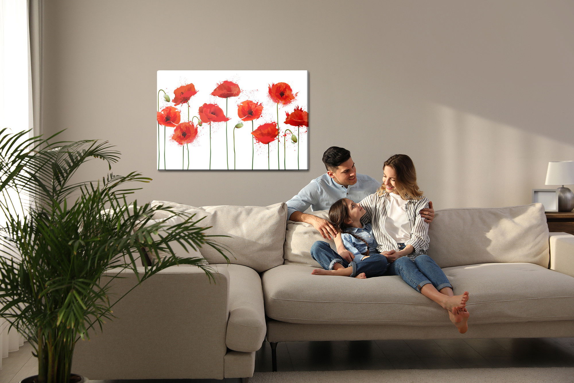 Varje tavla monteras på en massiv fururam. Format upp till 70×50 cm har en ram på 15 mm, medan format från 90×60 cm och uppåt har en ram på 20 mm. Den exakta dukspänningen gör att tavlan håller sin form över tid. Motivet Red poppies in an abstract trycks runt hela ramen vilket ger ett stilrent galleriuttryck där tavlan är lika vacker från sidan som framifrån. Kombinationen av rak dukspänning, rena linjer och korrekt tryck ger en professionell finish.