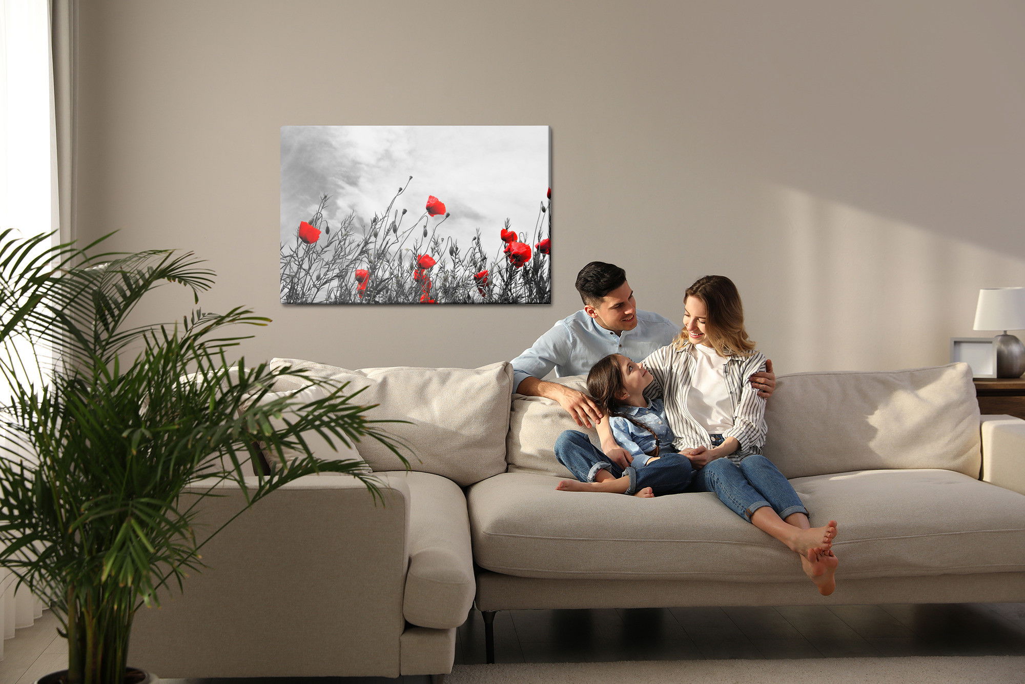 Varje tavla monteras på en massiv fururam. Format upp till 70×50 cm har en ram på 15 mm, medan format från 90×60 cm och uppåt har en ram på 20 mm. Den exakta dukspänningen gör att tavlan håller sin form över tid. Motivet Red poppies on a black trycks runt hela ramen vilket ger ett stilrent galleriuttryck där tavlan är lika vacker från sidan som framifrån. Kombinationen av rak dukspänning, rena linjer och korrekt tryck ger en professionell finish.