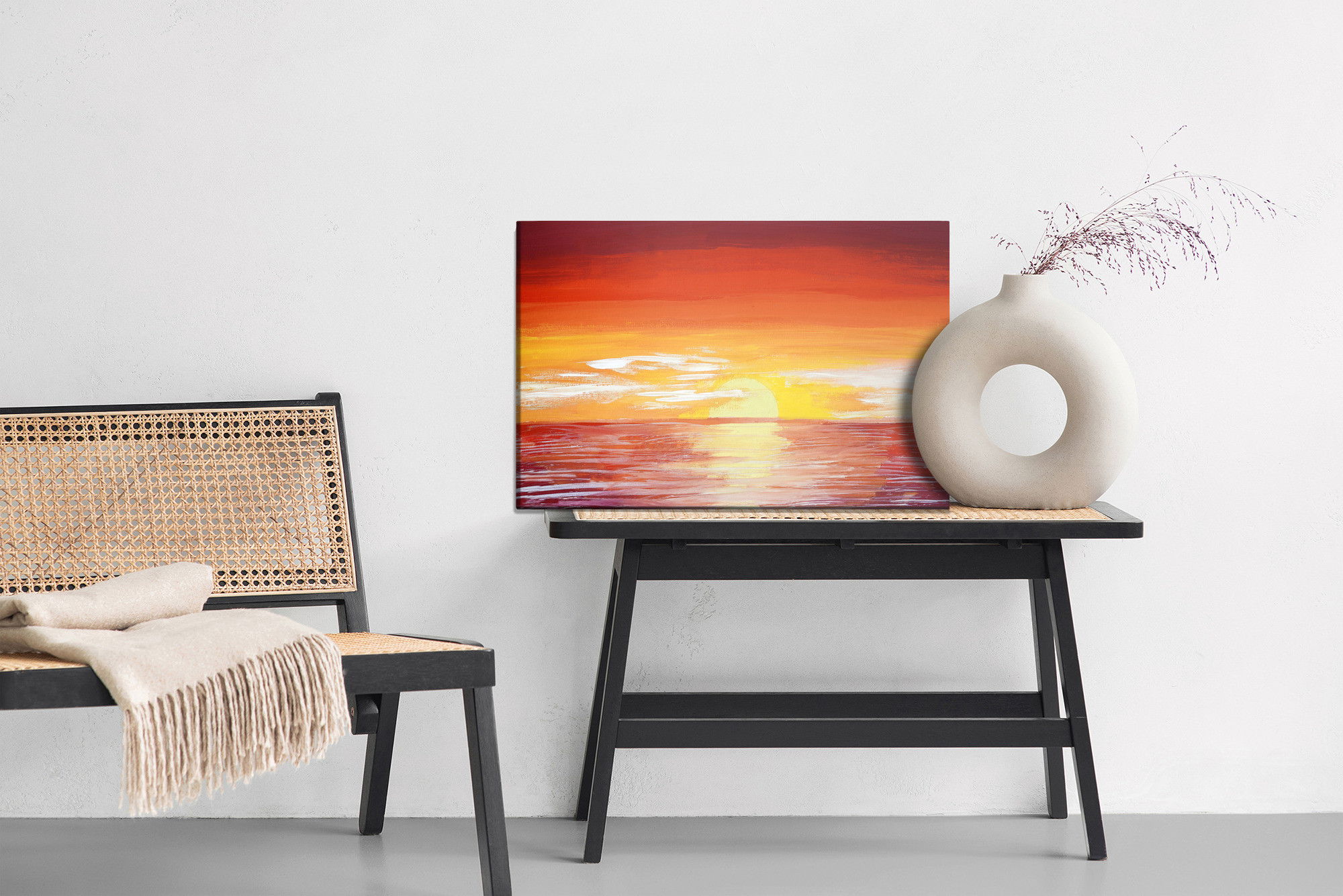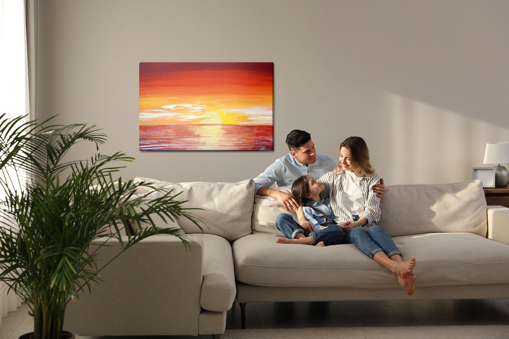 Varje tavla monteras på en massiv fururam. Format upp till 70×50 cm har en ram på 15 mm, medan format från 90×60 cm och uppåt har en ram på 20 mm. Den exakta dukspänningen gör att tavlan håller sin form över tid. Motivet Red sunset on the sea trycks runt hela ramen vilket ger ett stilrent galleriuttryck där tavlan är lika vacker från sidan som framifrån. Kombinationen av rak dukspänning, rena linjer och korrekt tryck ger en professionell finish.