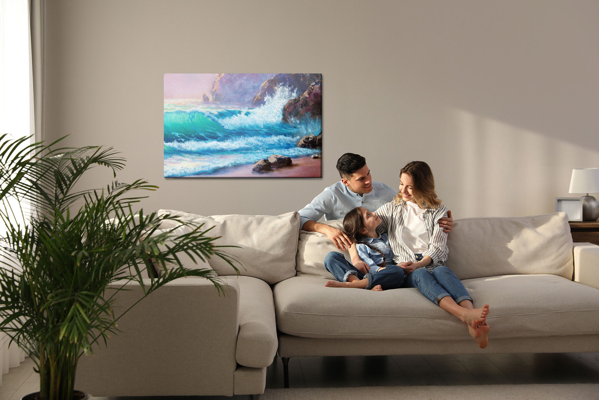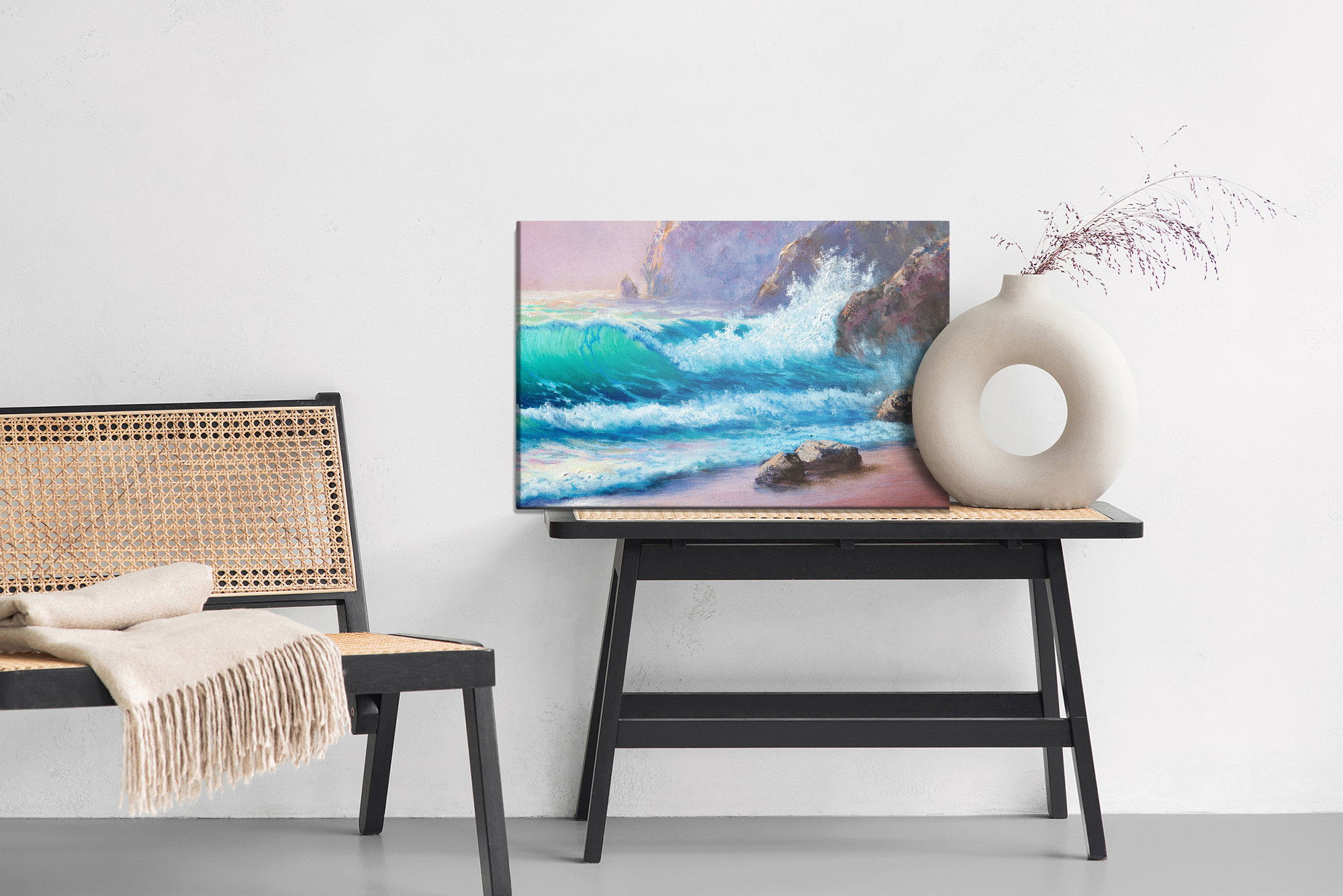 Varje tavla monteras på en massiv fururam. Format upp till 70×50 cm har en ram på 15 mm, medan format från 90×60 cm och uppåt har en ram på 20 mm. Den exakta dukspänningen gör att tavlan håller sin form över tid. Motivet Rocks by the sea trycks runt hela ramen vilket ger ett stilrent galleriuttryck där tavlan är lika vacker från sidan som framifrån. Kombinationen av rak dukspänning, rena linjer och korrekt tryck ger en professionell finish.