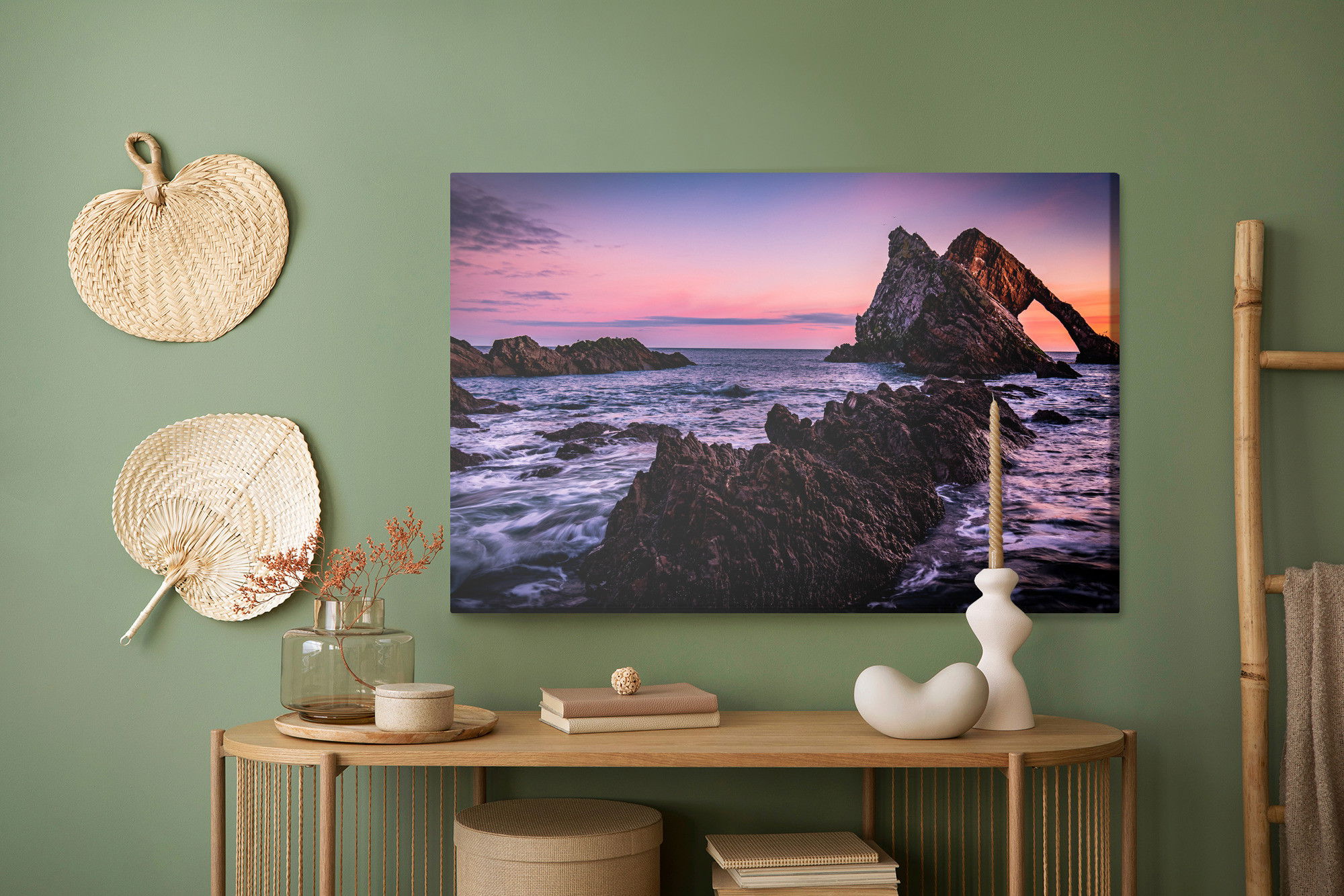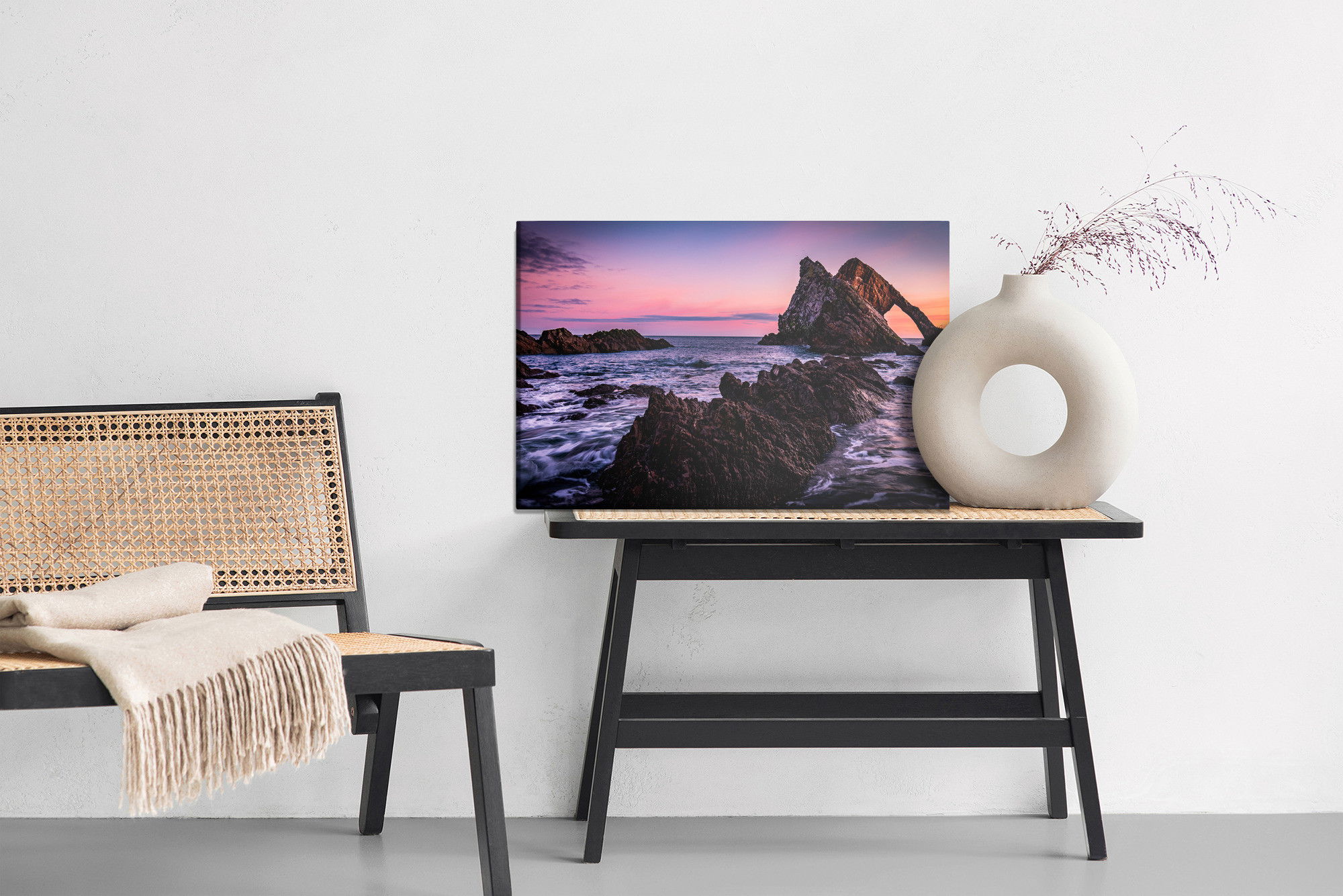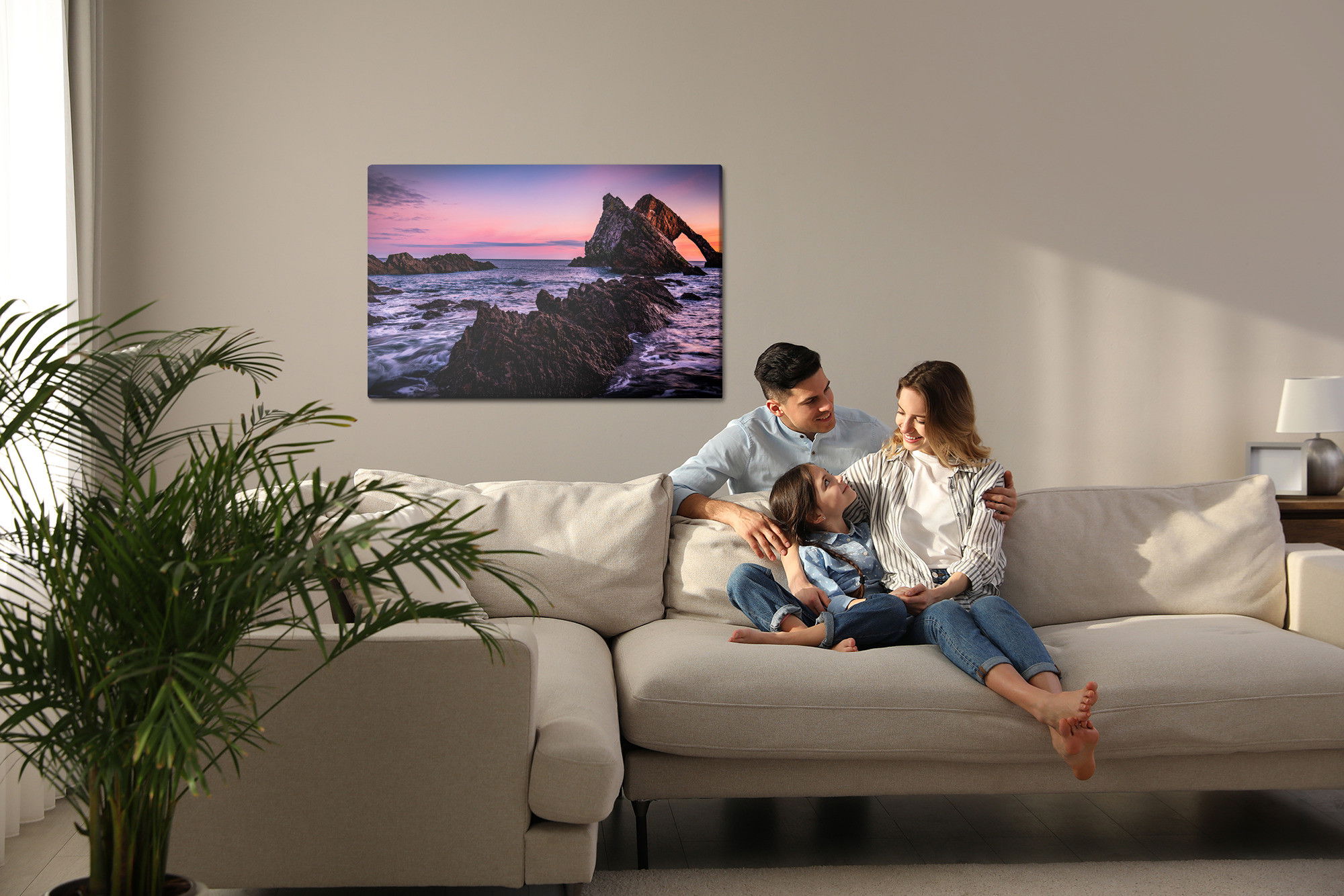 Varje tavla monteras på en massiv fururam. Format upp till 70×50 cm har en ram på 15 mm, medan format från 90×60 cm och uppåt har en ram på 20 mm. Den exakta dukspänningen gör att tavlan håller sin form över tid. Motivet Rocks in the sea trycks runt hela ramen vilket ger ett stilrent galleriuttryck där tavlan är lika vacker från sidan som framifrån. Kombinationen av rak dukspänning, rena linjer och korrekt tryck ger en professionell finish.