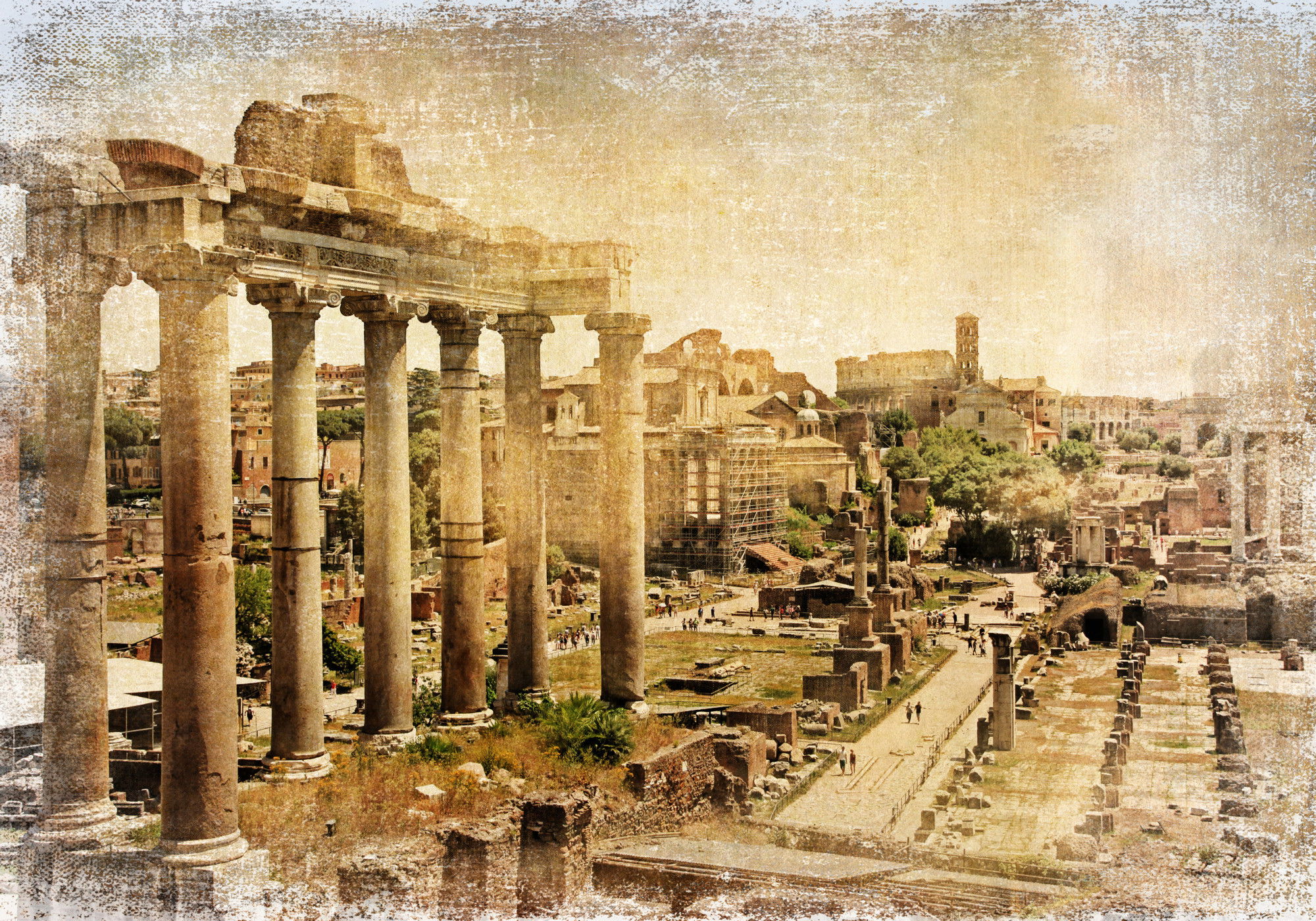 Motivet Roman forum återges med hög färgprecision och detaljrikedom tack vare HP Latex-teknologi. Trycket sker med vattenbaserade, luktfria och GREENGUARD Gold-certifierade bläck som ger en upplösning på upp till 300 DPI. Färgerna är UV-beständiga och behåller sin styrka även i ljusa rum, vilket gör tavlan lämplig för både hem- och offentliga miljöer.