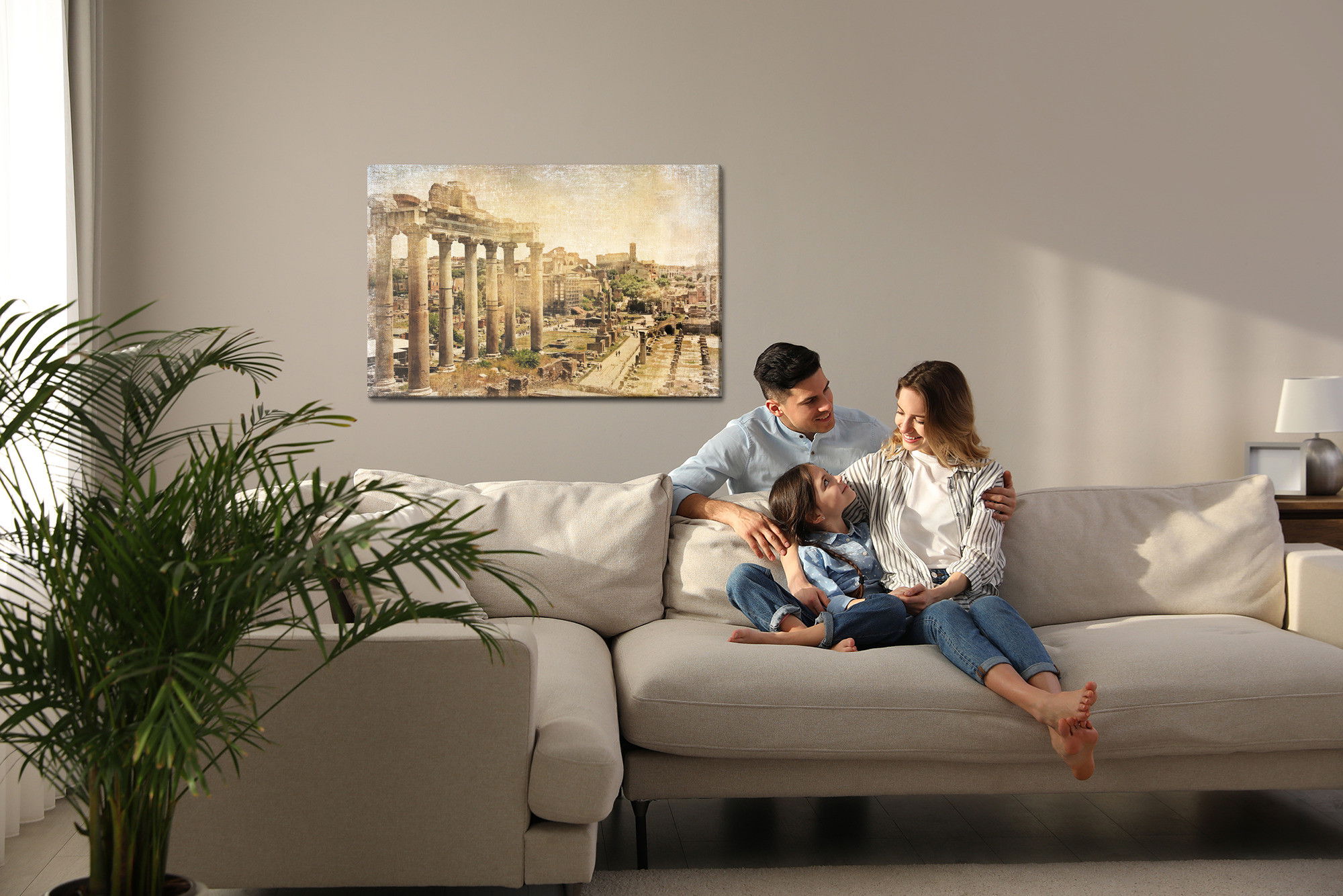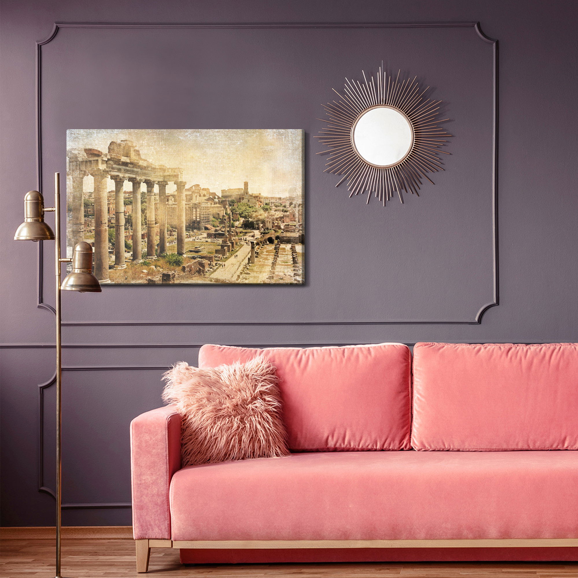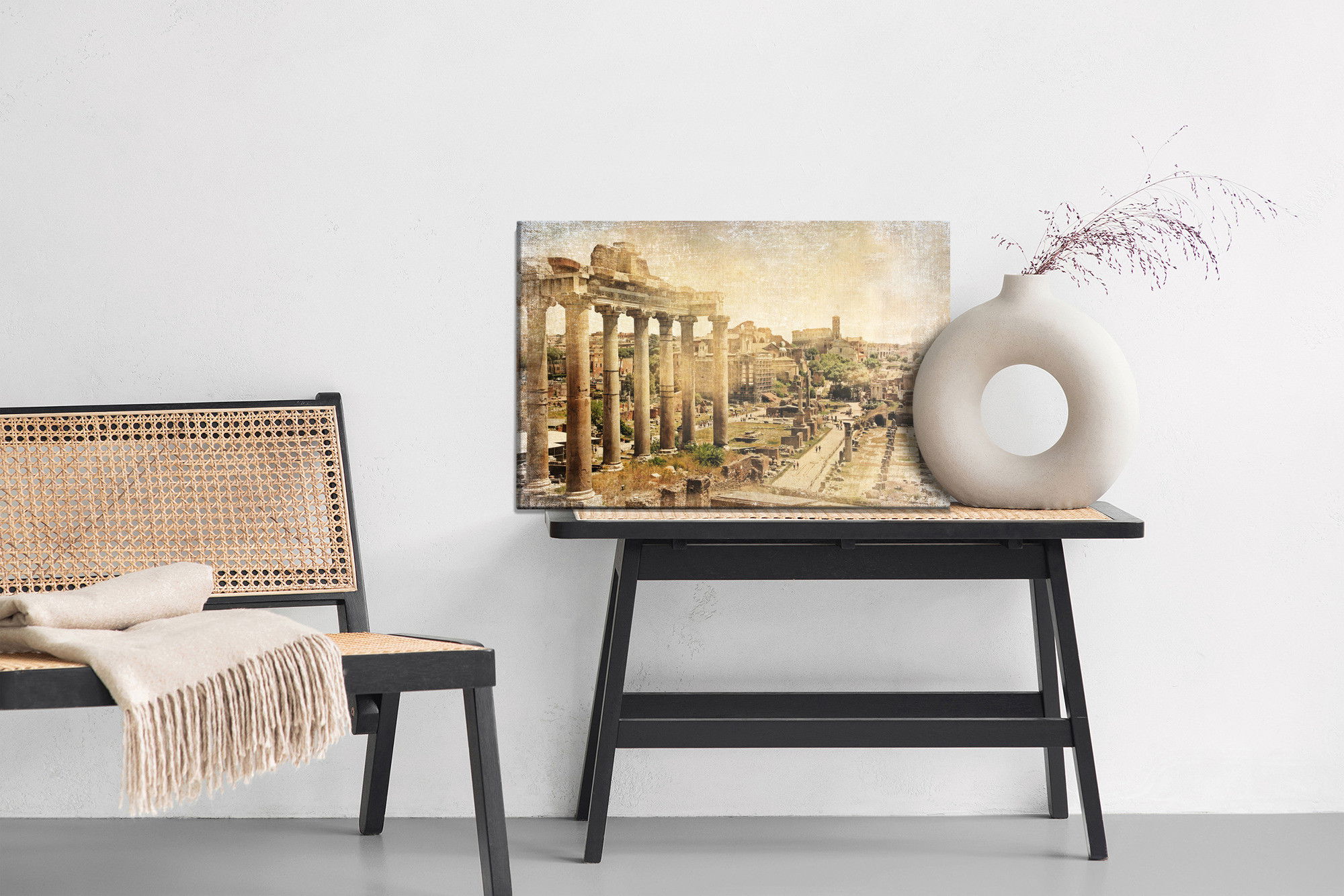 Varje tavla monteras på en massiv fururam. Format upp till 70×50 cm har en ram på 15 mm, medan format från 90×60 cm och uppåt har en ram på 20 mm. Den exakta dukspänningen gör att tavlan håller sin form över tid. Motivet Roman forum trycks runt hela ramen vilket ger ett stilrent galleriuttryck där tavlan är lika vacker från sidan som framifrån. Kombinationen av rak dukspänning, rena linjer och korrekt tryck ger en professionell finish.