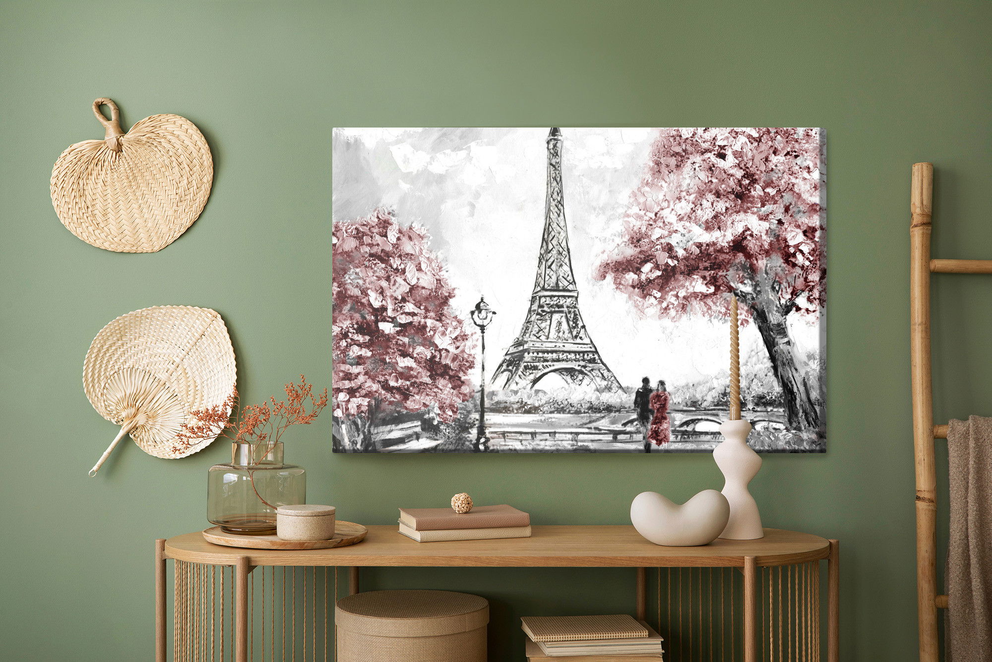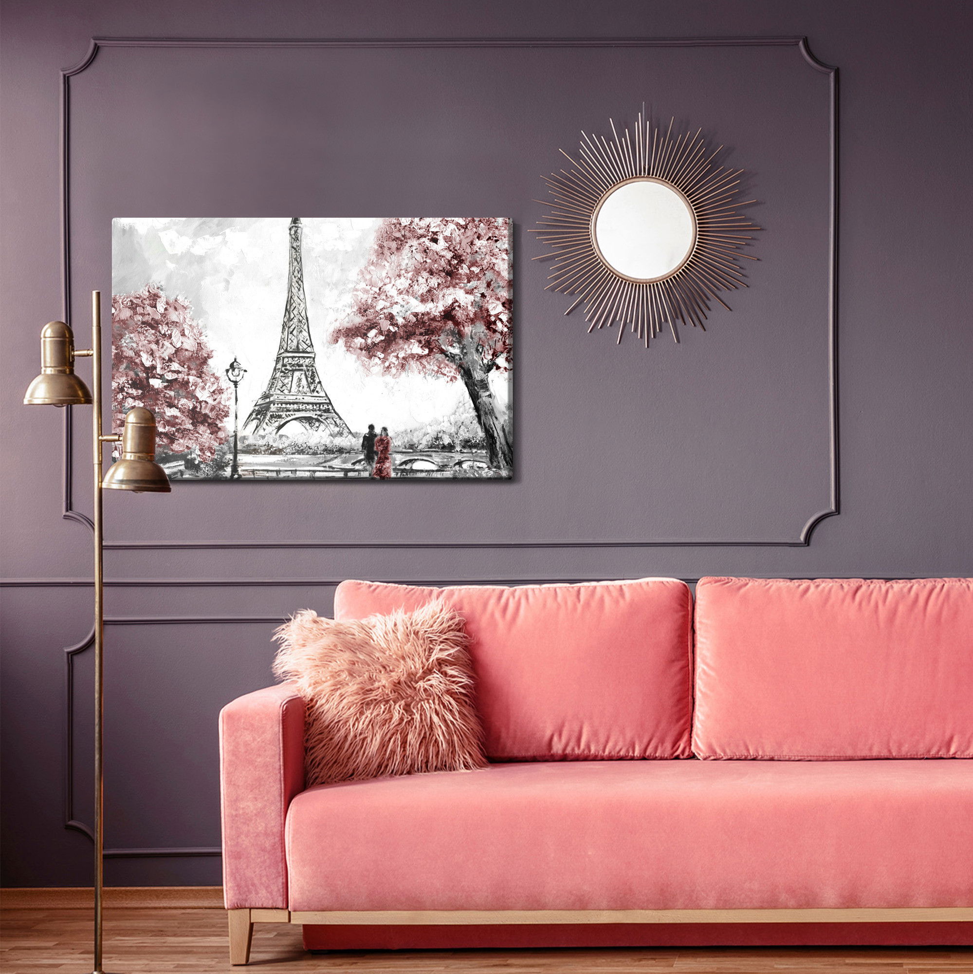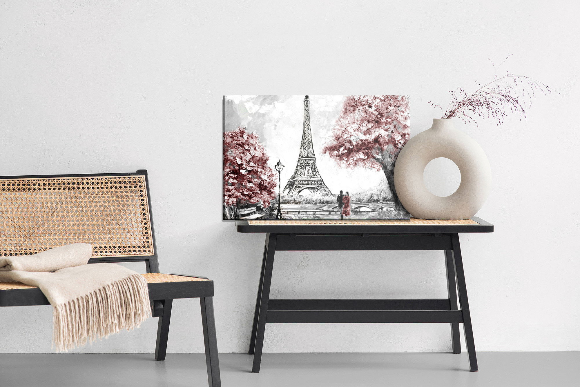 Varje tavla monteras på en massiv fururam. Format upp till 70×50 cm har en ram på 15 mm, medan format från 90×60 cm och uppåt har en ram på 20 mm. Den exakta dukspänningen gör att tavlan håller sin form över tid. Motivet Romantic view in Paris trycks runt hela ramen vilket ger ett stilrent galleriuttryck där tavlan är lika vacker från sidan som framifrån. Kombinationen av rak dukspänning, rena linjer och korrekt tryck ger en professionell finish.