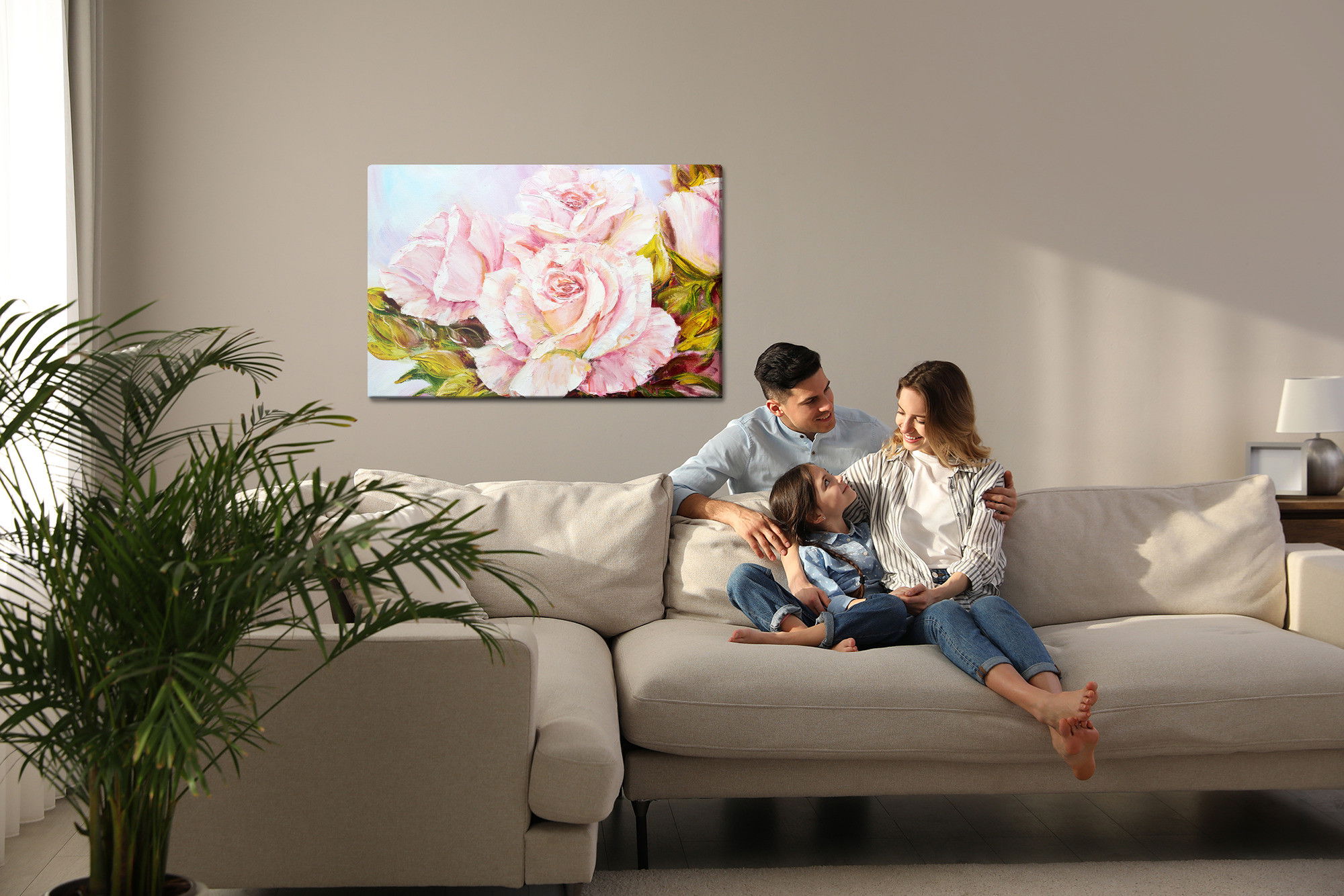 Varje tavla monteras på en massiv fururam. Format upp till 70×50 cm har en ram på 15 mm, medan format från 90×60 cm och uppåt har en ram på 20 mm. Den exakta dukspänningen gör att tavlan håller sin form över tid. Motivet Roses as painted trycks runt hela ramen vilket ger ett stilrent galleriuttryck där tavlan är lika vacker från sidan som framifrån. Kombinationen av rak dukspänning, rena linjer och korrekt tryck ger en professionell finish.