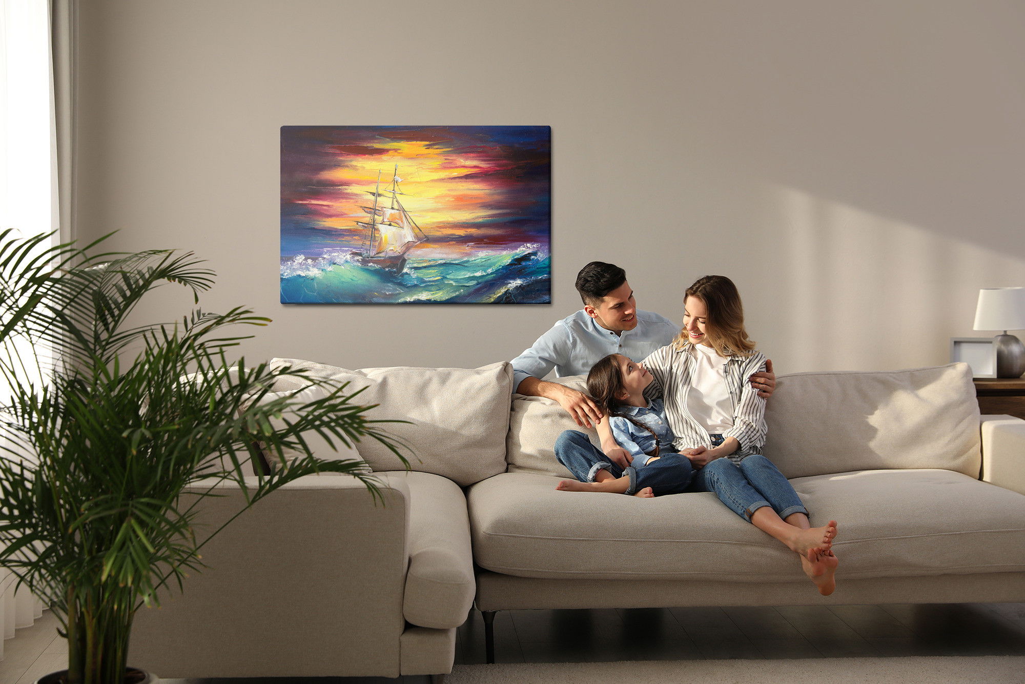 Varje tavla monteras på en massiv fururam. Format upp till 70×50 cm har en ram på 15 mm, medan format från 90×60 cm och uppåt har en ram på 20 mm. Den exakta dukspänningen gör att tavlan håller sin form över tid. Motivet Rough sea and a ship trycks runt hela ramen vilket ger ett stilrent galleriuttryck där tavlan är lika vacker från sidan som framifrån. Kombinationen av rak dukspänning, rena linjer och korrekt tryck ger en professionell finish.