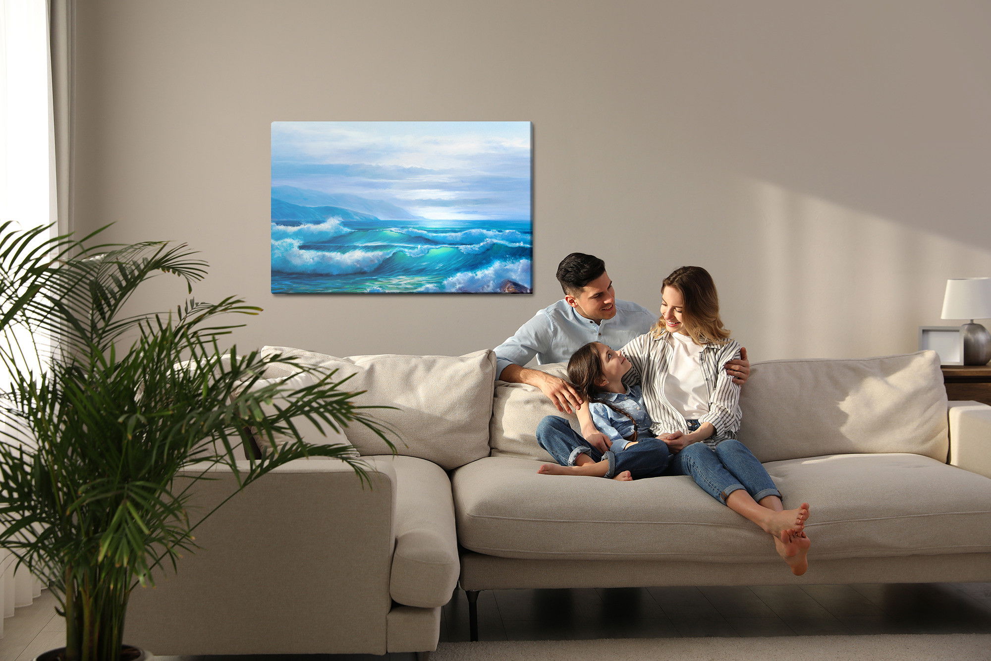 Varje tavla monteras på en massiv fururam. Format upp till 70×50 cm har en ram på 15 mm, medan format från 90×60 cm och uppåt har en ram på 20 mm. Den exakta dukspänningen gör att tavlan håller sin form över tid. Motivet Rough sea waves trycks runt hela ramen vilket ger ett stilrent galleriuttryck där tavlan är lika vacker från sidan som framifrån. Kombinationen av rak dukspänning, rena linjer och korrekt tryck ger en professionell finish.
